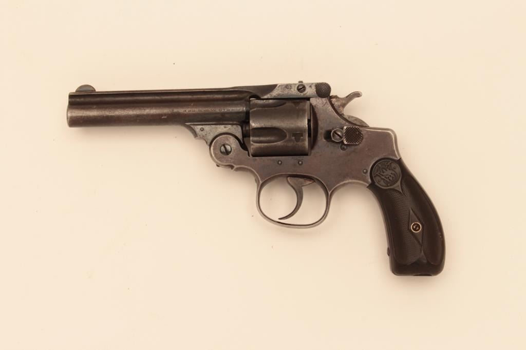 Scarce Smith & Wesson perfected model .38 caliber double action revolver, S/N 38655. The barrel has been professional (Possibly factory shortened) to 4”. 20%-40% original blue with minor erosion and normal aginggrips show a chip to the left bottom and some wear. The action and bore are good. (C&R/No PPT) Est.: $250-$500