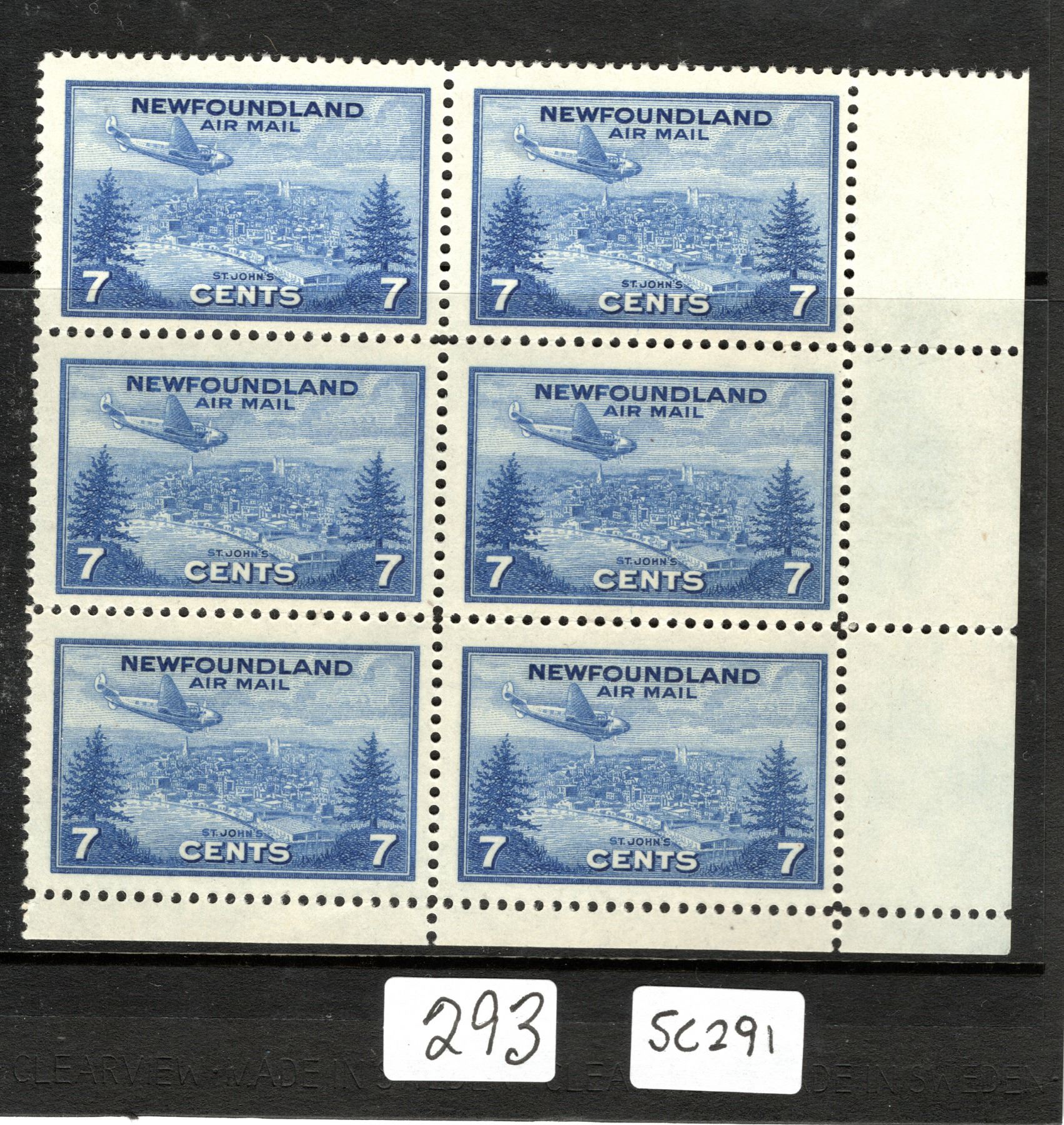 SCARCE SCOTT 291 NEWFOUNDLAND CORNERBLOCK OF 6 7C AIRMAIL STAMPS