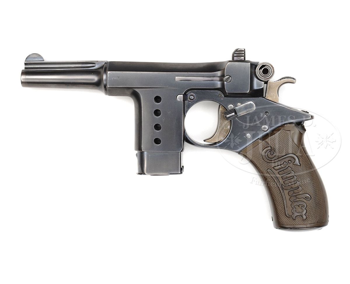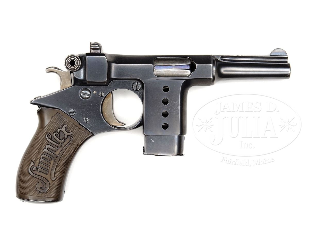 SN 3163. 2.7" 8mm bbl. Serial number on bottom of grip plate. "PAT" on left frame. Visible numbered parts are matching. Second variation is much rarer, with a mag release button on the right side behind magazine and above trigger. Original dark brown plastic one piece grips have "Simplex" on both sides. Proper 8-shot magazine. CONDITION: Very fine restored to 97% blue with minor visible pitting under the blue on the front of the frame, the front of the magazine, and under the trigger guard. 95% straw. Bore is worn with pitting. Good grips with a repaired crack on the left side through the center going the length of the grip from top to bottom. Upper back grip area where it meets the frame is chipped away for about 1/3 of an inch. Mechanics are sound. 4-49377 BWS104