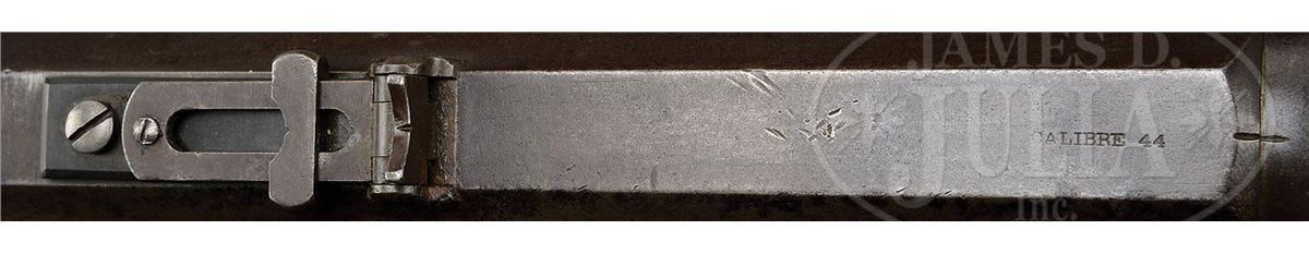 SN 158654. Cal. 44-90 Sharps 2-5/8". Fine heavy Sharps rifle with 30" extra heavy oct bbl, globe front sight with pin & Sharps ladder rear sight. Top flat, forward of the rear sight is marked with the "Old Reliable" cartouche & Brigdeport address. Caliber marking is stamped over the chamber area. Mounted with uncheckered, straight grain American walnut with straight stock and coarse checkered Sharps steel buttplate. Also has double set triggers. All accessible parts are matching numbered including the receiver, bbl, lock plate, trigger plate, buttplate & buttstock. While the forearm number could not be discerned, an impression of the bbl number was completely visible in mirror image. Accompanied by a Sharps factory records letter which identifies this rifle as a Model 1874 Sporting rifle, invoiced at Bridgeport on Sept. 18, 1876 to B. Kittredge & Co., Cincinnati, OH. It is described as being a .44-90 caliber with 30" oct bbl, double triggers, open sights & oil finish stocks and weighed 15 lbs, 14 oz. In the same order were 5 sporting rifles identically configured & all weighing about 16 lbs, along with three 14 lb rifles in .50 cal & 2 business rifles. Dr. Richard J. Labowskie, the owner of the Sharps records, states that the B. Kittredge Co. was a major distributor of Sharps rifles 1876 to 1878 & wholesaled guns throughout the Midwest & Trans-Mississippi West by means of their catalogs & traveling representatives. He states "many collectors consider the Kittredge-shipped Sharps to be western guns, and those of large caliber & heavy weight are particularly associated with the Texas buffalo hunt". CONDITION: About fine, all matching. Bbl retains about 75% of a plummy/brown patina with some fine pitting over the forearm area. Each side of the bbl at the chamber area, has vice marks. Receiver retains traces of silvered case colors with the balance a dark patina. One receiver screw is a replacement and top tang is broken through the front screw hole but is still in place & easily repairable by a competent gunsmith. Lock plate & trigger plate are mottled silvered case colors. Lever has a dark plum patina. Buttstock has a fine hairline and repaired crack in the wrist, otherwise is sound with numerous nicks, scratches & dings and retains about 75% dull, dark, orig varnish. Forearm is missing long slivers of wood on each side, otherwise is sound showing a fine hand-worn patina. Mechanics are fine. Worn bore with good shine and very fine scattered pitting. 4-48285 JR265