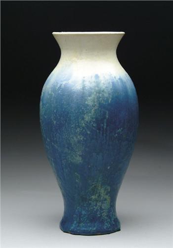 SCARCE SIGNED TALL FULPER VASE W/CHINESE BLUE GLAZE. Scarce tall Fulper vase ranges from a mottled blue at the base to a frothy white at the top. Signed with impressed elongated "Fulper" signature. SIZE: 13-1/2 in. t. CONDITION: Generally very good. 5-61501