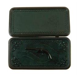 SCARCE SMITH & WESSON 1ST MODEL REVOLVER GUTTA PERCHA CASE. Made of brown gutta percha, 7-7/8" long x 4-1/8" wide x 1-3/8" deep with a 1st model revolver embossed on the lid. It has raised embossed foliate & shield decorations in each corner. The bottom has border decorations of tiny revolvers. The interior is lined with rose colored velvet and has a rest for the revolver and a cartridge block in the front. The inside of the lid has a pressed arabesque pattern decoration. CONDITION: The lid has been recently repaired after having been broken in several places. These repairs are virtually indistinguishable and would go unnoticed if not pointed out. The rest of the case has a few tiny chips on the edges, otherwise is completely intact. The lid lining is dark with an impressed spot from the revolver. The bottom lining is faded and soiled. 8-87248 JR810