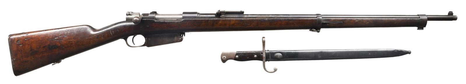 ACTION RIFLE. Cal. 7.65 Arg. S# H2734. Bbl. 29". Matching numbers on bbl., bolt, mag., rear sight & rear sight tab. Stock number is illegible. This rifle is one of an estimated 10,000 Argentine 1891 Mauser rifles that were diverted from Argentina to Spain after an 1894 rebellion in Morocco. After the rebellion was over, these guns were sent to Spanish occupation forces in Cuba. They would of course see use in the Spanish American War. Following that conflict the guns were sent to Springfield Armory were they were auctioned off and 2,047 sold to Bannerman the well known NYC surplus dealer. These Spanish issued guns fall in the G & H prefix ranges & have the older Gew 88 style 2000m rear sight. Most notably they lack crests unlike a standard Argentine issued rifle. Walnut stock w/ bottom mounted sling swivels. No handguard or cleaning rod present. UNATTACHED ACCESSORIES: Argentine 1909 bayonet w/ matching numbered scabbard & unground crest in good condition. CONDITION: stock has an older oil finish w/ faint Argentine cartouches, scattered dings & handling marks. Metal is turning to a brown patina w/ heavy oxidation ahead of rear sight, further scattered oxidation & traces of original blue. Fair bore w/ worn rifling & scattered frosting. (01-23846/MJC). ANTIQUE. $300-500.