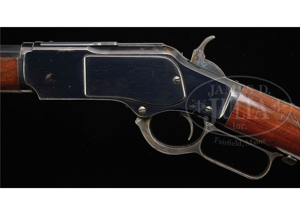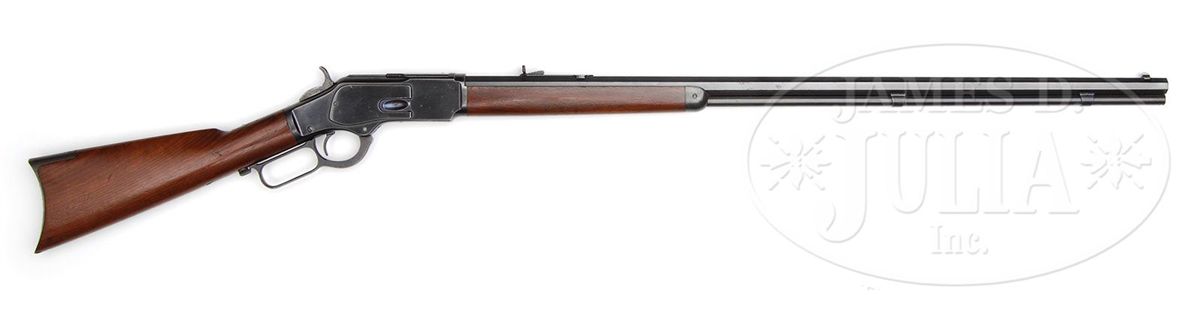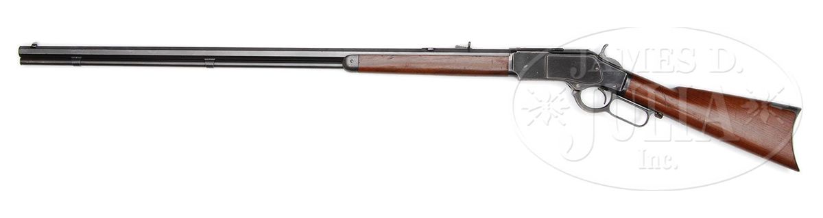 SN 366936. Cal. 32 WCF (32-20). Standard grade rifle with 32" oct bbl, full magazine with two bands, half nickel front sight and semi-buckhorn rear sight. Mounted with uncheckered straight grain American walnut with straight stock and crescent buttplate without trap. While extra-length bbls on Winchesters are occasionally encountered they are rarely found with a 32" or longer bbl. PROVENANCE: Wes Adams Estate Collection. CONDITION: Extremely fine. Bbl & magazine tube retain about 98% crisp orig blue with faint sharp edge wear and a few pin prick spots of light surface rust; receiver retains 96-98% strong orig blue with light sharp edge wear and two small cleaned spots on left side; lever & hammer retain brilliant case colors lightly faded on outer faces of lever; buttplate retains dark case colors with some spotted scaly rust on the tang. Stock has a little gouge on top of the wrist, otherwise wood is sound with a few scattered light nicks & scratches and overall retains most of its strong orig factory varnish, slightly dulled on right side of forearm. Mechanics are crisp, brilliant shiny bore, shows very little use retaining most of its orig blue on the bolt face. 4-44593 JR44