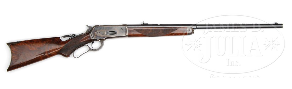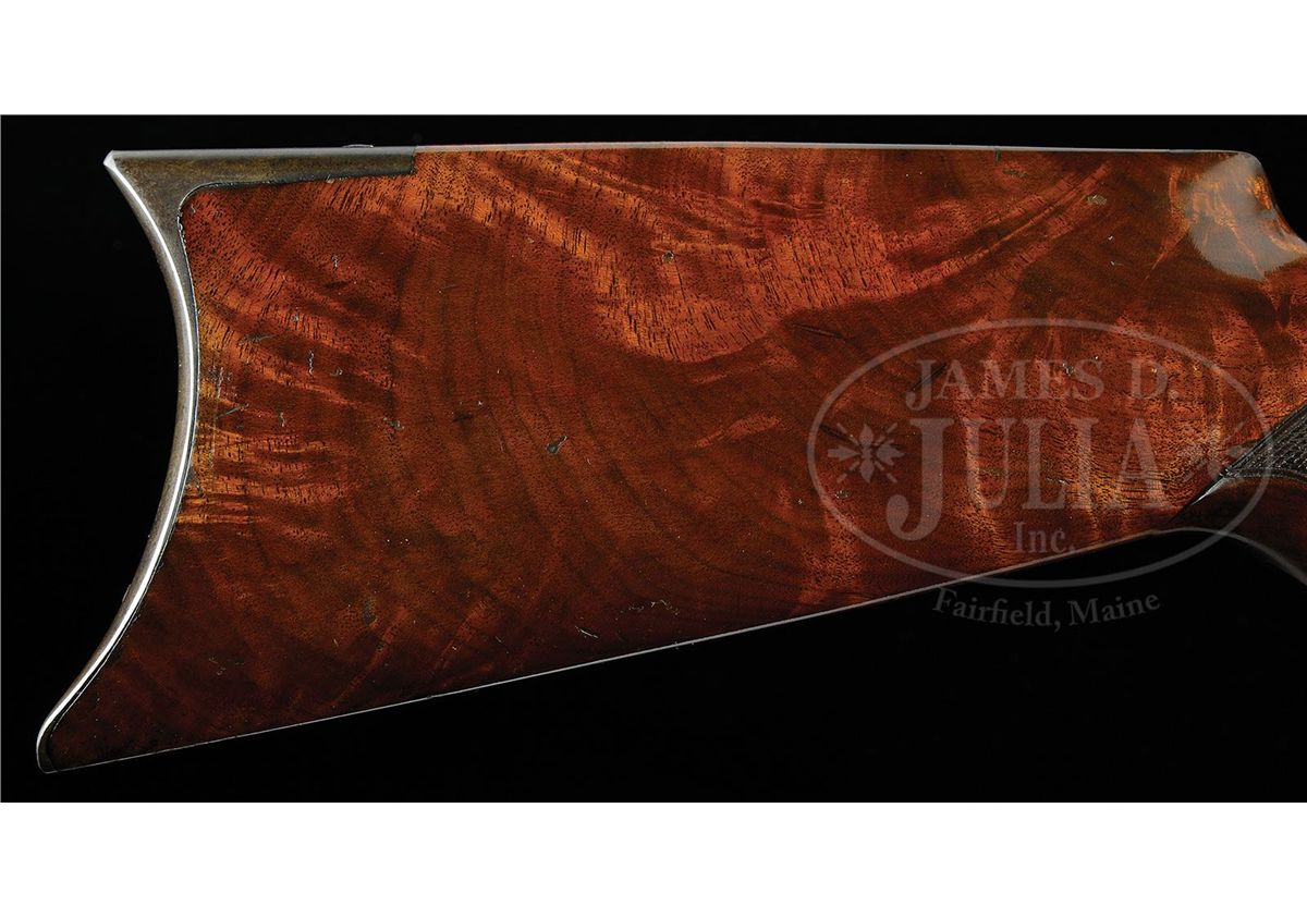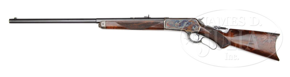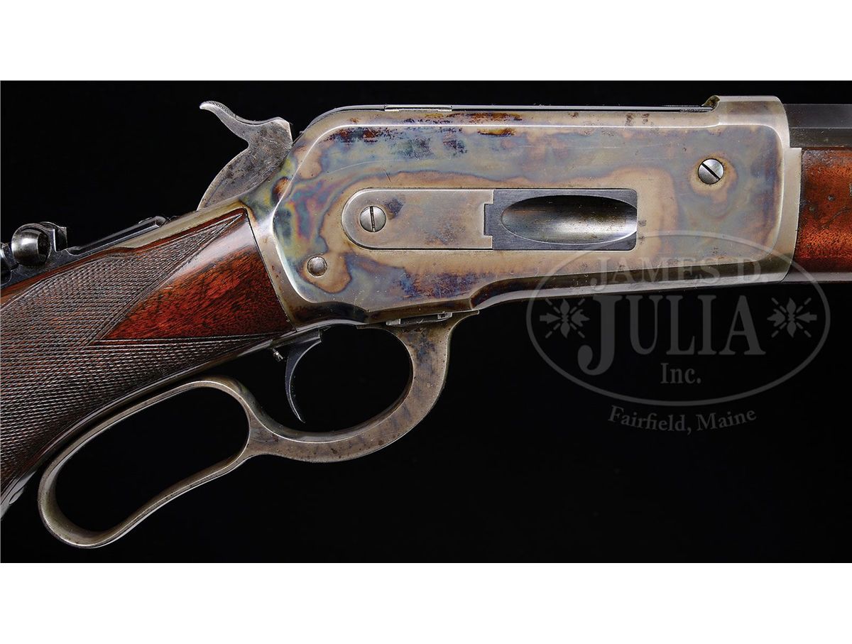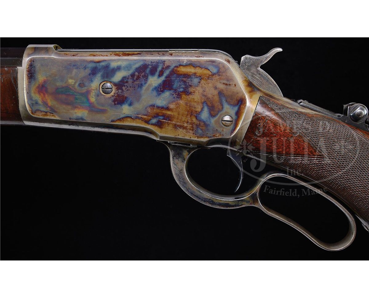 SN 70616. Cal. 45-90. Fine special order '86 with 26" oct to rnd bbl, button magazine, half nickel front sight, semi-buckhorn rear sight and a Lyman combination tang sight. Lower tang has sgl set trigger and is marked on left side, under the wood, with assembly number "475" and "XX". Top tang channel of buttstock has the normal sized assembly number "113" and a tiny reverse stamped assembly number "70014". Toe of the buttplate is stamped with assembly number "183". Accompanied by a Cody Firearms Museum letter which identifies this rifle in caliber 45-90 with half oct bbl, half magazine, Lyman front & rear sights, set trigger and checkered pistol grip stock, received in warehouse Oct. 22, 1892 and shipped same day to Order #8121. PROVENANCE: Wes Adams Estate Collection. CONDITION: Very fine. Bbl retains 96-97% strong orig blue with only faint sharp edge wear and a couple of small nicks; receiver retains about 85% orig case colors, brilliant on left side, moderately faded on right side and top, heavily faded on bottom; hammer retains strong, bright case colors and the lever strong case colors on sides, heavily faded & turning silver on outer faces; buttplate is mostly a gray patina. Stock has a repaired chip back of top tang, otherwise wood is sound with a few handling & storage marks and overall retains most of its strong orig piano varnish finish. Mechanics are crisp, bright shiny bore. 4-44479 JR28