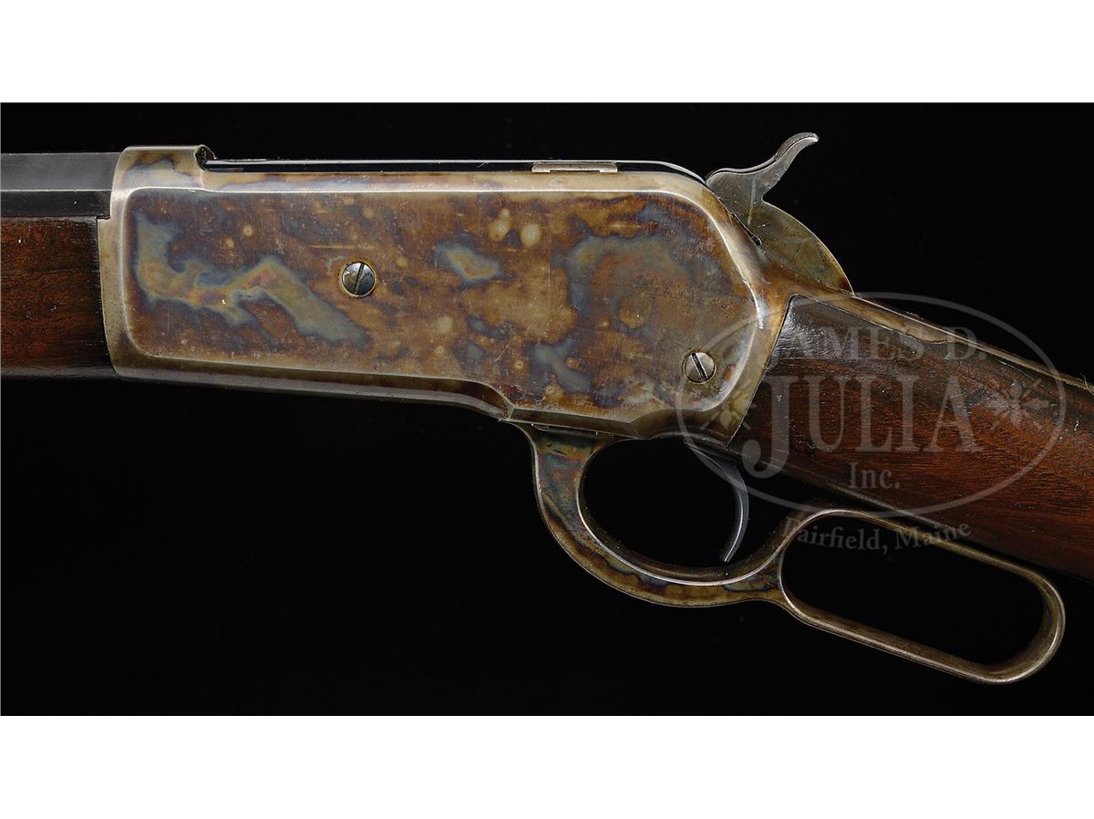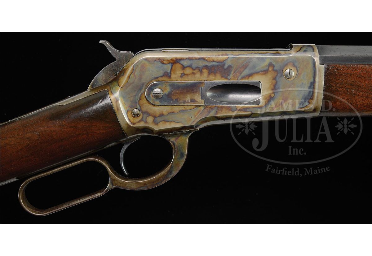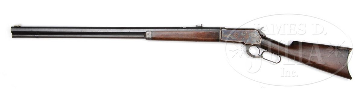 SN 27690. Cal. 45-90. Standard grade rifle with 30" extra heavy oct bbl, full magazine, German silver Rocky Mountain front and semi-buckhorn rear sights. Mounted with straight grain, uncheckered American walnut with straight stock & crescent buttplate. Accompanied by a Cody Firearms Museum letter identifying this rifle, as found, with 30" extra heavy oct bbl, received in warehouse Jan. 22, 1890 and shipped next day, no Order # listed. PROVENANCE: Wes Adams Estate Collection. CONDITION: Very fine. Bbl retains about 95% orig blue with sharp edge wear, a few small spots of scattered light surface rust and slight thinning over the chamber area; magazine tube retains 88-90% dulling orig blue with a few spots of pin prick pitting; receiver retains 93-95% orig case colors, strong & bright on the sides, lightly to moderately faded over the top & bottom with distinct second coat lacquer lines along each edge of the bottom; hammer retains strong case colors, turned dark on top edge and the lever bright case colors on the sides, moderately faded on outer faces; buttplate retains traces of case colors, mostly turned dark. Wood is sound with light nicks & scratches and retains most of an old refinish; stock may be an old replacement. Mechanics are crisp, strong bright bore with some minor roughness. 4-44484 JR30
