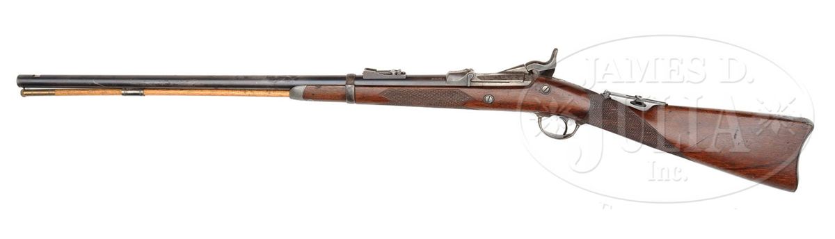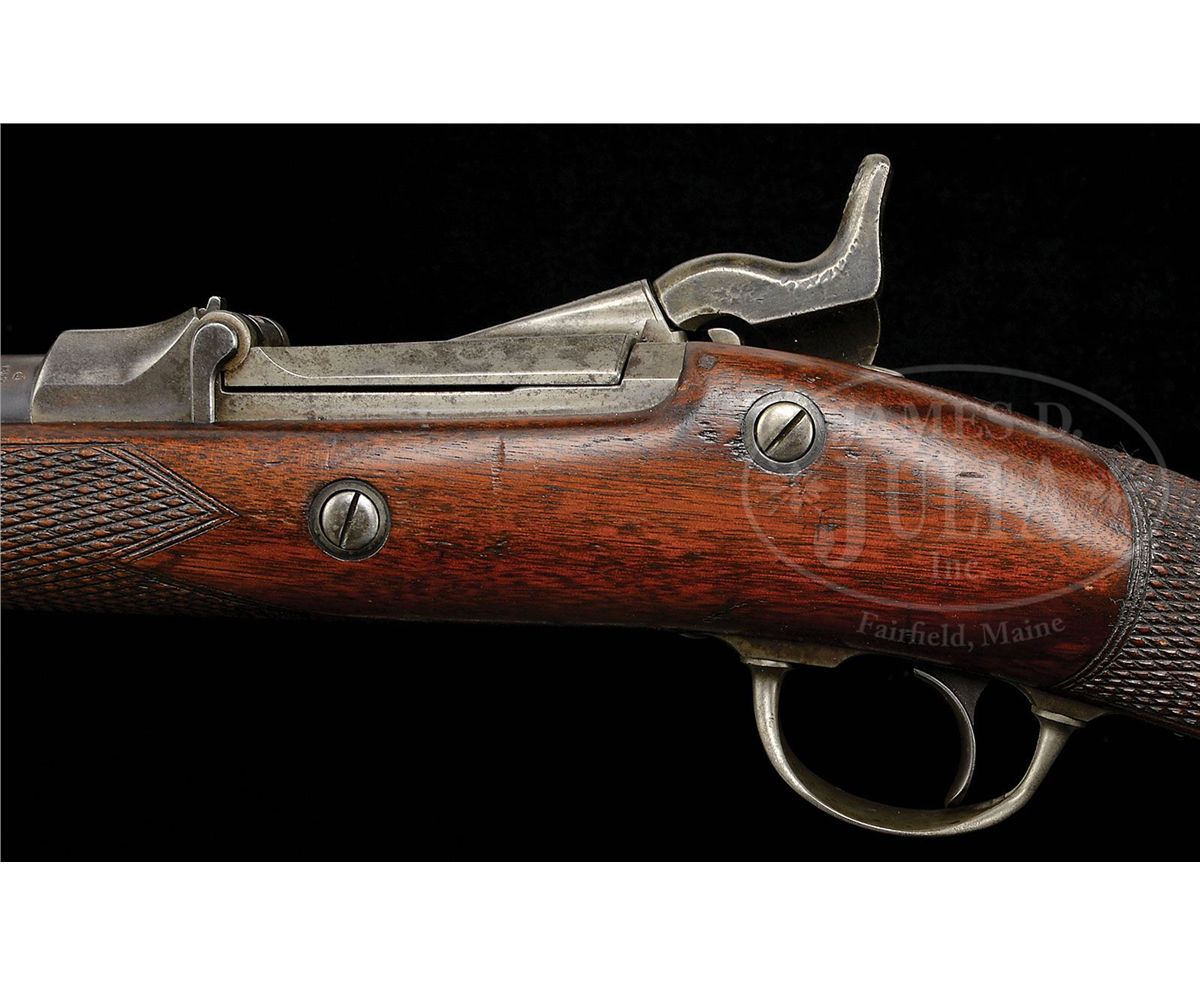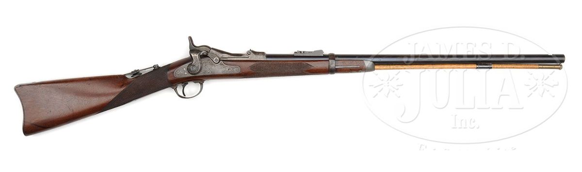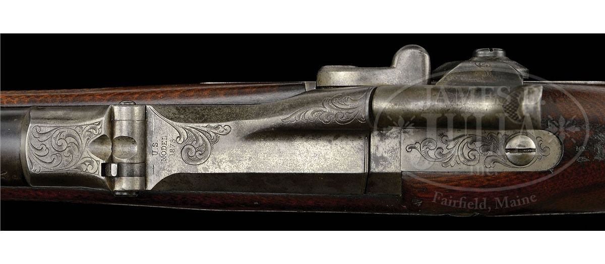 Cal. 45-70. Scarce first type officer's model with 26" rnd bbl, missing the front sight & 1200 yd musket ladder rear sight. The high arch breech block has the 1873 markings and the lock plate is simply marked "U.S. / SPRINGFIELD" forward of a spreadwinged American eagle. Mounted in a 1-pc walnut half stock with coarse checkered forearm & straight stock that has musket/carbine buttplate without trap. Forearm has a pewter tip in foliate pattern & forearm is secured by a single band with spring keeper. Top of the wrist is mounted with the first type tang sight with rnd base screwed into the wood. Trigger is single-set style. Lock plate, hammer, breech block, thumb lever, trigger guard, front receiver ring, bbl band, forend cap & buttplate tang are very nicely engraved in flowing foliate arabesque patterns with light shading. Bbl has the standard "VP" and eagle inspector marks & the buttplate tang is marked "US". Bottom of the bbl has a single iron guide which contains a hickory and brass cleaning rod. According to Flayderman's Guide to Antique American Firearms only about 125 of these rifles were produced in the period 1875 to 1877. They were initially intended as special order items for military officers but later were awarded as shooting prizes and eventually civilians were even allowed to purchase them. CONDITION: Good to very good. Bbl retains strong blue in sheltered areas with the balance a light brown patina with an area of rust pitting on top & bottom just forward of the forearm. Lockplate, hammer, breechblock & receiver retain silvered case colors with faded colors inside the breech block. Stock has a couple of scrapes with a few light nicks & scratches, shows moderate wear with a few dings on the checkering and overall retains most of it's orig oil finish. Mechanics are fine. Strong, sharp bore with good shine and moderate pitting. 4-49071 JR270