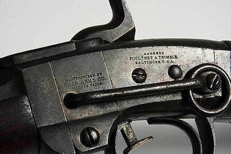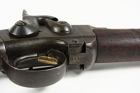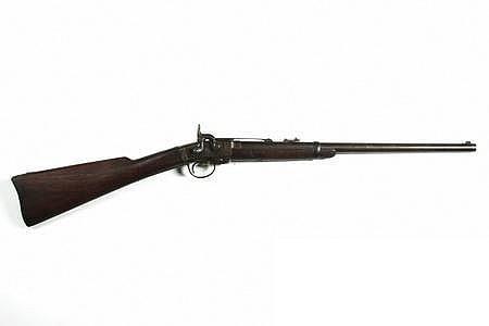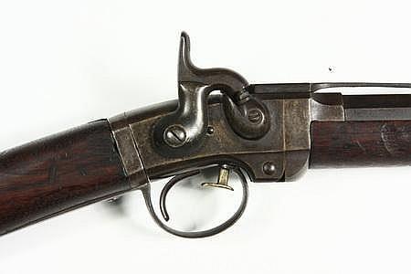 SCARCE TRAPDOOR CARBINE - Smiths Cavalry Carbine, .54 cal trapdoor with breech release inside trigger guard, serial number 19233, patent 1857, manufactured by the Massachusetts Arms Company of Chicopee Falls, Mass; sold by Poultney & Trimble of Baltimore, Maryland, and marked by both, with a 20IN smoothbore barrel, percussion lock, sliding graduated sight, eight coup marks on the walnut stock, 39 1/4IN long overal.