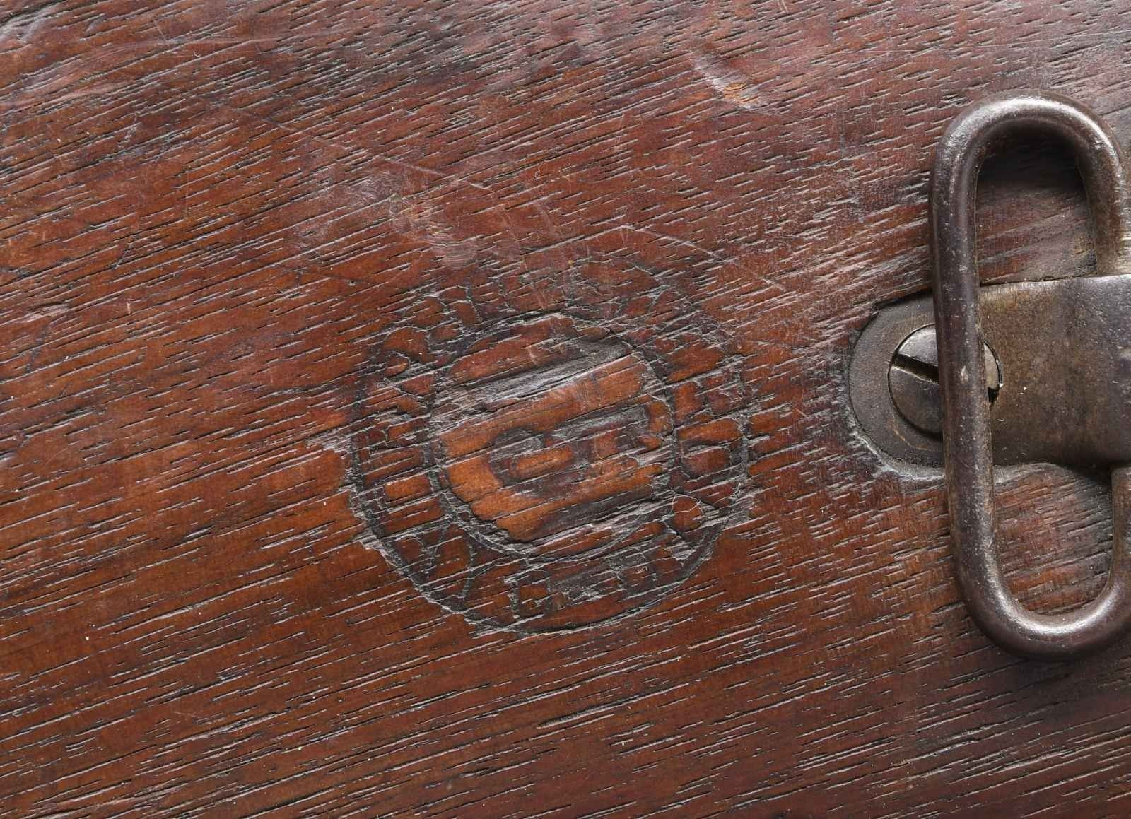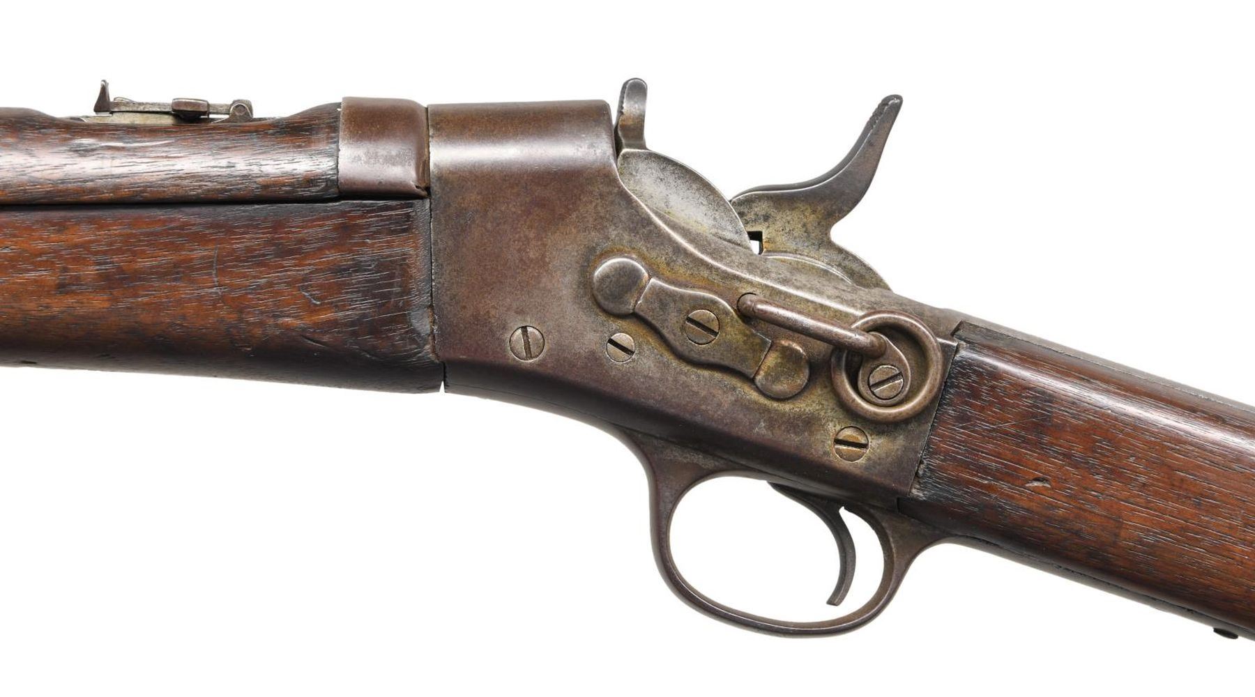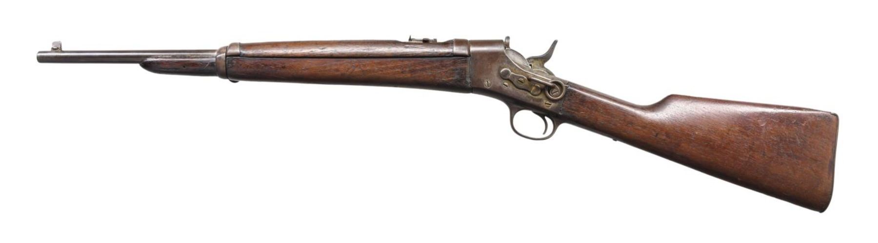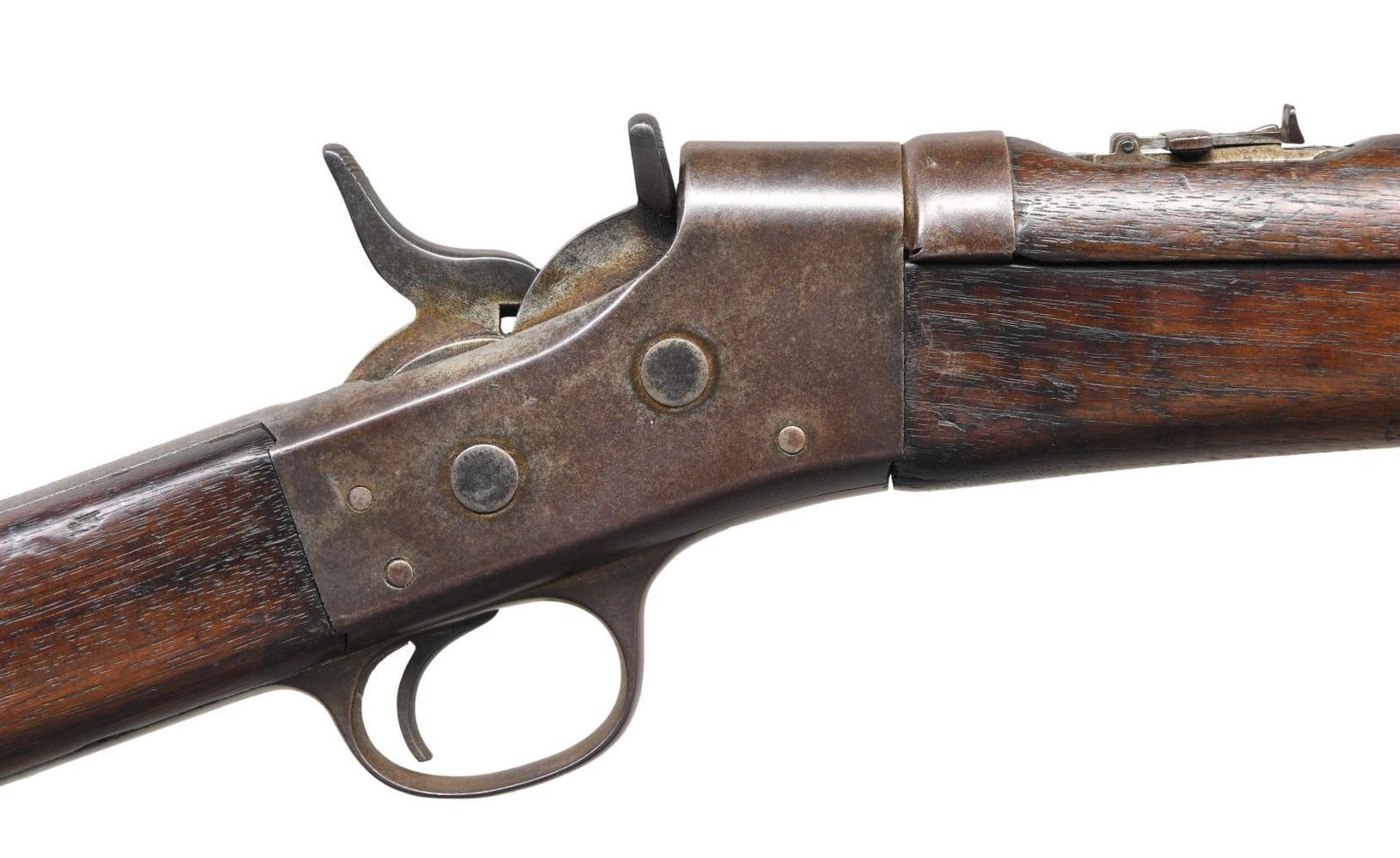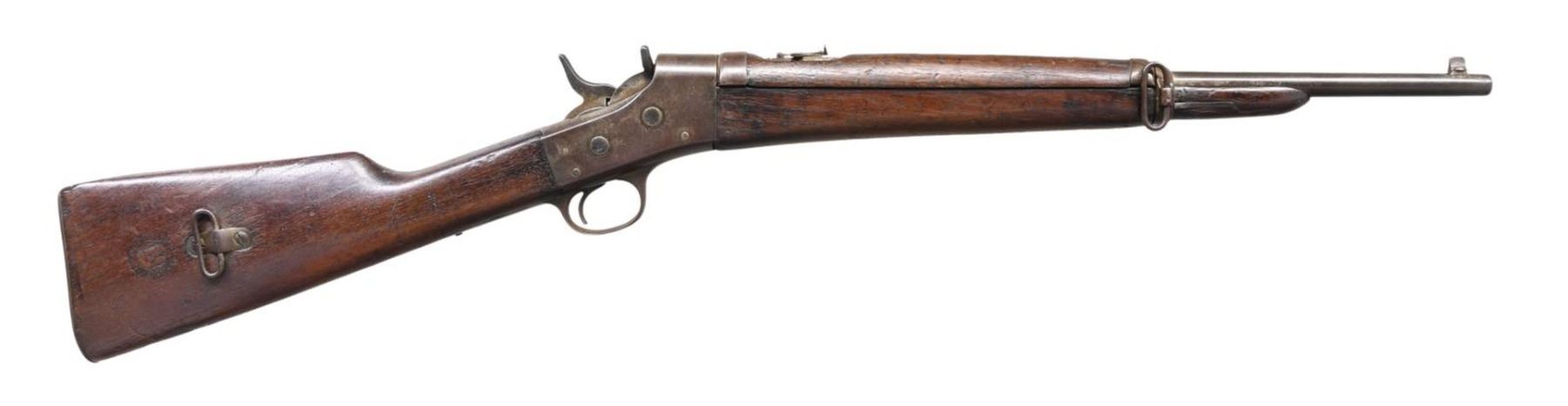 BLOCK SINGLE SHOT SADDLE RING CARBINE. Cal.7MM Mauser. S# 2217873 visible on receiver tang when buttstock is removed. Bbl. 20 1/2". Marked on top "1204" and CAL 7MM. Ladder rear sight graduated to 1300 meters. Inverted "V" front sight. Receiver tang marked "REMINGTON ARMS CO."/ ILION, N.Y. U.S.A./ PATENTED OCTR. 22ND 1902. Saddle ring mounted on left side of receiver. Rotary extractor. Walnut stock set. Buttstock marked on the right side with a circular cartouche which although well worn appears to read "EJERCITO URUGUAYO" and "15" in the center. Side swivels on the right side. Forend is held by a single band which is retained by a spring. CONDITION: this carbine has seen a great deal of hard service but retains its original finish. The stock set is well worn and has numerous scratches and handling marks. Buttstock has a number of small cracks at heel and at the ends of the tangs. The forend has small cracks at the rear. The hand guard has an extensive crack extending the full length along the top with a missing chip. The metal is well worn, turning patina with oxydation and fine pitting. The bore is turning dark with heavily worn lands. (24-1424/RW). CURIO $700-1,000.