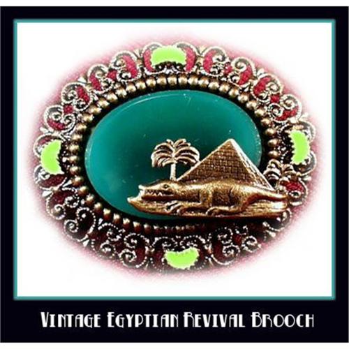 Scarce vintage Egyptian Revival brooch with pyramid, palm trees and Nile crocodile over faux jade centerpiece. Dark antique gold filigree setting. Excellent condition. It is extremely difficult to capture the beauty, which eye so easily perceives, picture just doesn't do the justice to this exquisite piece. Dimension : just short of 2" wide. Acquired (1991) in Czechoslovakia from the sample room of now defunct costume jewelry maker. This company produced high quality jewelry also for DIOR. This piece was never worn and made during 1950-70's era.