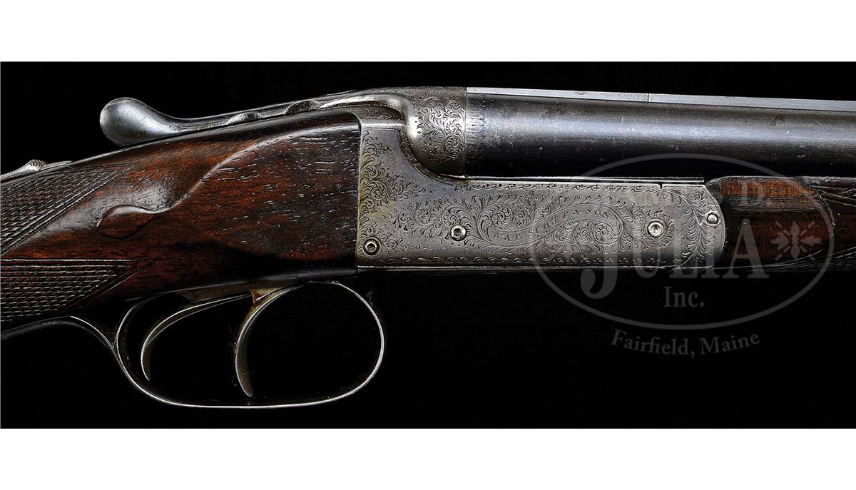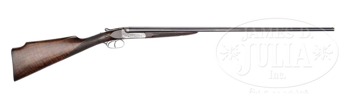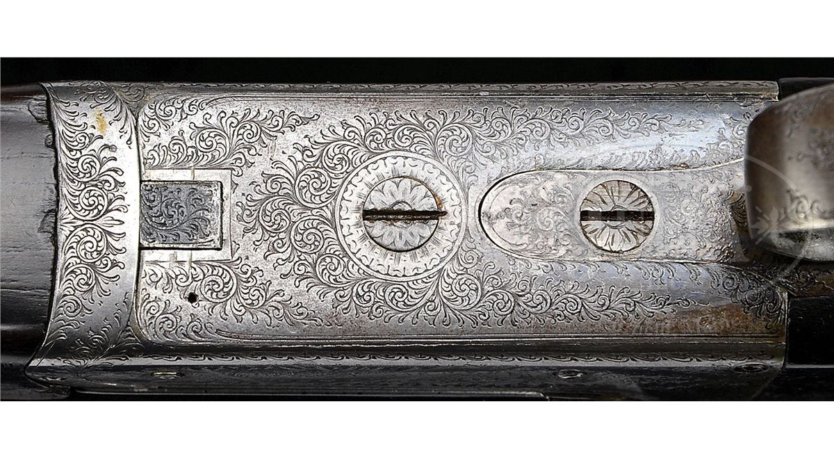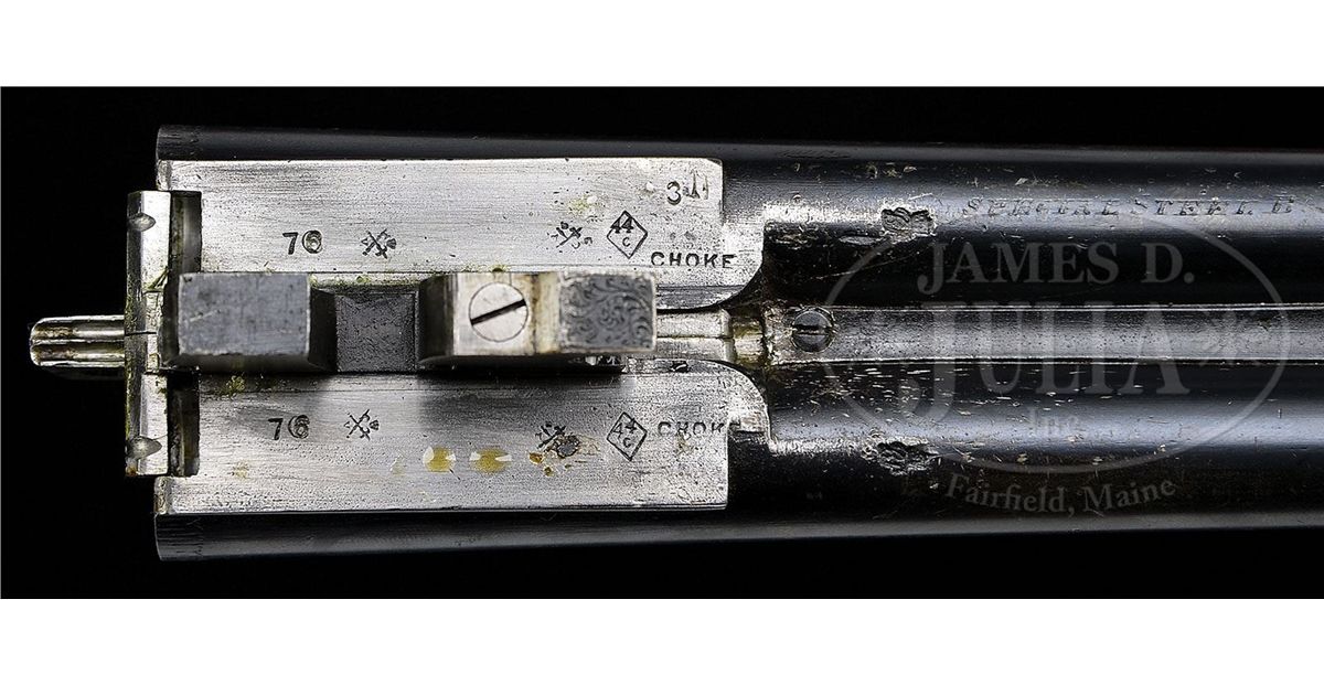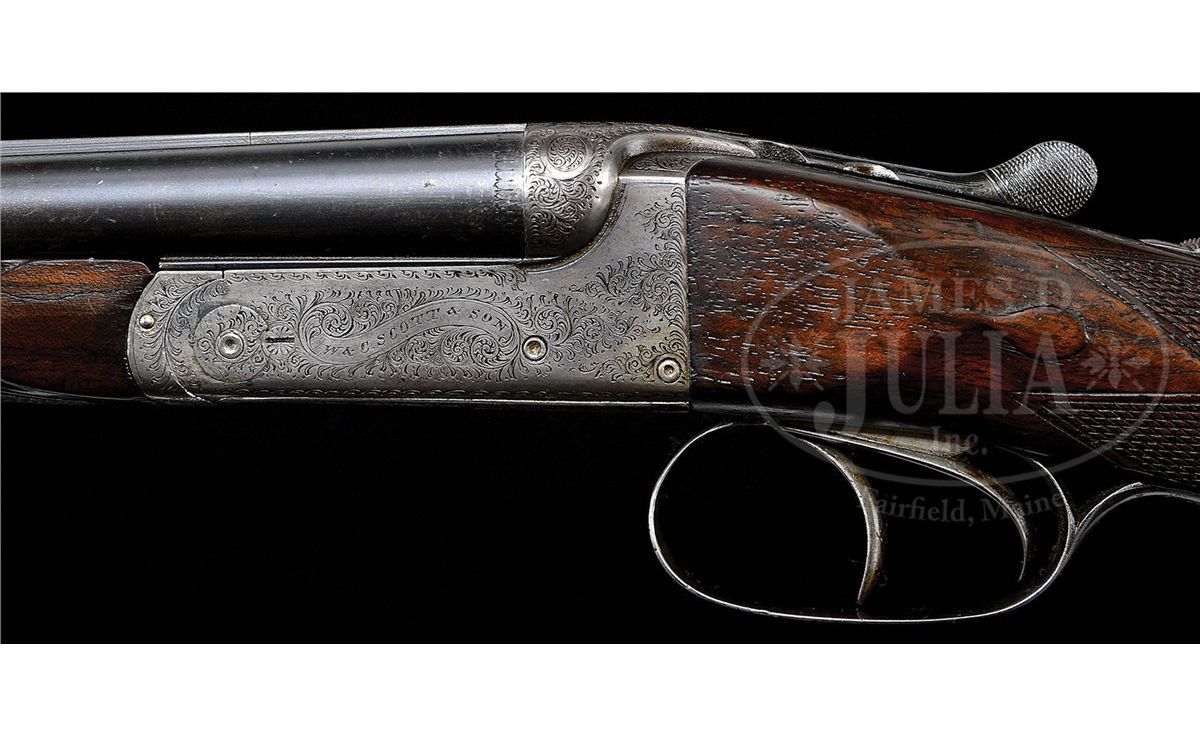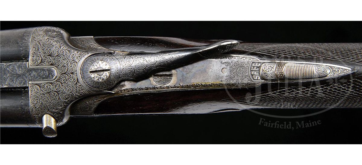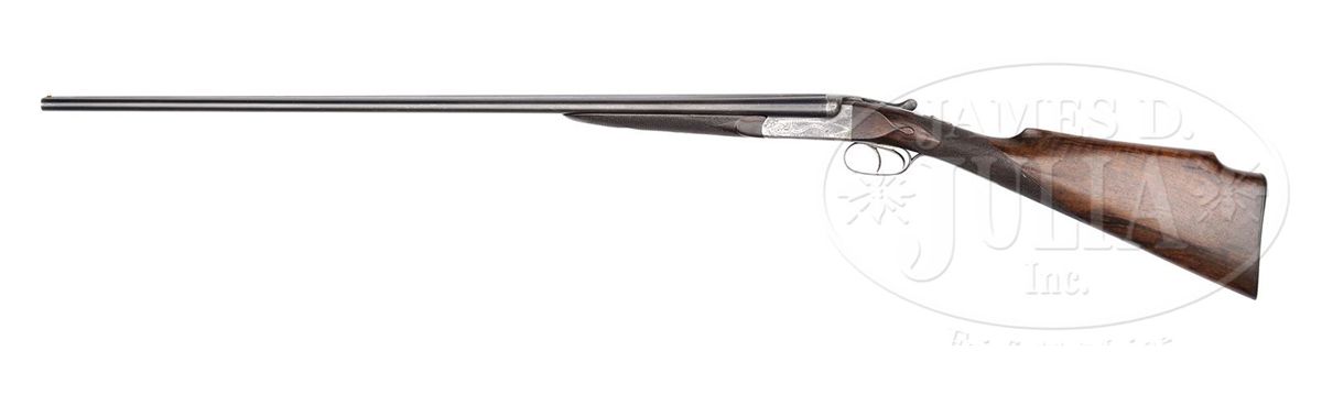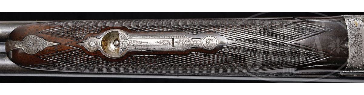 ADDITIONAL INFORMATION (09-23-13): W.C. Scott information letter states gun is "Model 146 B Quality", chambered as a "76 bore" designed for 44 caliber shotshells, and is the first example the firm has encountered. SN 60708. (1898) Cal. .410. 3" Chambers. This very unusual little gun, configured like a pigeon gun, has 28" dovetailed steel bbls with raised, flat, matted rib, giving single sighting plqne. Tops of bbls are engraved "W & C. Scott & Son 78 Shaftesbury Avenue" and "London England". Bbl flats are stamped with Birmingham black powder proofs, and with "76". Bottom of right bbl is engraved "Special Steel B". Small boxlock action features automatic safety (SAFE relief engraved), crossbolt third fastener, and double triggers. Action is engraved with well cut medium scroll at about 60% coverage. "W & C. Scott & Son" is in scroll terminated ribands on each side. Scroll engraved trigger guard has SN and Scott castle logo at grip. Well fiddle figured and lightly streaked European walnut straight grip buttstock measures 14-1/16" over ribbed hard rubber buttplate, and features unusual Monte Carlo comb, as well as, side panels with drop points, flat top point pattern checkering, and a vacant silver oval on toe line. Matching splinter ejector forend has engraved steel tip, and Deeley release. Bore diameter at muzzles: left-.394 (Mod?), right -.400 (IC?). Wall thickness: left -.038, right -.040. Drop at heel: 2-15/16", drop at rear of Monte Carlo: 2-1/8", Drop at comb: 1-1/4". Weight: 4 lbs. 14 oz. LOP: 14-1/16". PROVENANCE: W.C. Scott information letter states gun is "Model 146 B Quality", chambered as a "76 bore" designed for 44 caliber shotshells, and is the first example the firm has encountered.ÊÊ CONDITION: Fine. Bbls retain most of an old re-black, engraving somewhat softened. Action retains traces of orig case hardening color, but is mostly pewter gray. Floorplate and trigger guard retain a considerable amount of their orig blue. Top lever retains most of its blue, silvered at thumbpiece. Stocks retain most of what appears to be their orig finish with numerous marks and scratches commensurate with condition of the rest of gun. Checkering is somewhat worn. Areas on both sides of forend on top near iron, show cracks that have been repaired. Bores are excellent. Action is tight. Bbls are on face. Right ejector does not fire. 4-48692 MGM62