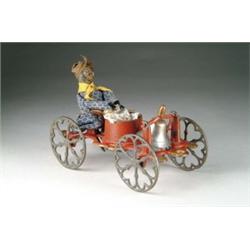 SCARCE “WASHER WOMAN” BY IVES, BLAKESLEE & WILLIAMS CO. A wonderful toy of a black lady and a cast iron wash tub. When the toy is rolled on the ground, she leans to and fro, scrubbing her wash while the bell tolls. On a red enameled base with gold highlighting, the figure, which is of typical Ives construction including the applied brass face, is similar in nature to the “TWILBY” BELL TOY by Ives. SIZE: 7 1/2". CONDITION: Overall condition is extremely fine, fair amount of paint loss of lady’s brass face. JL 1-4308 (6,000-8,000)