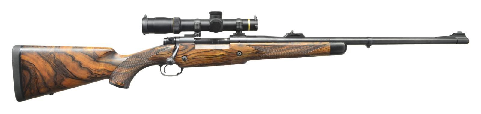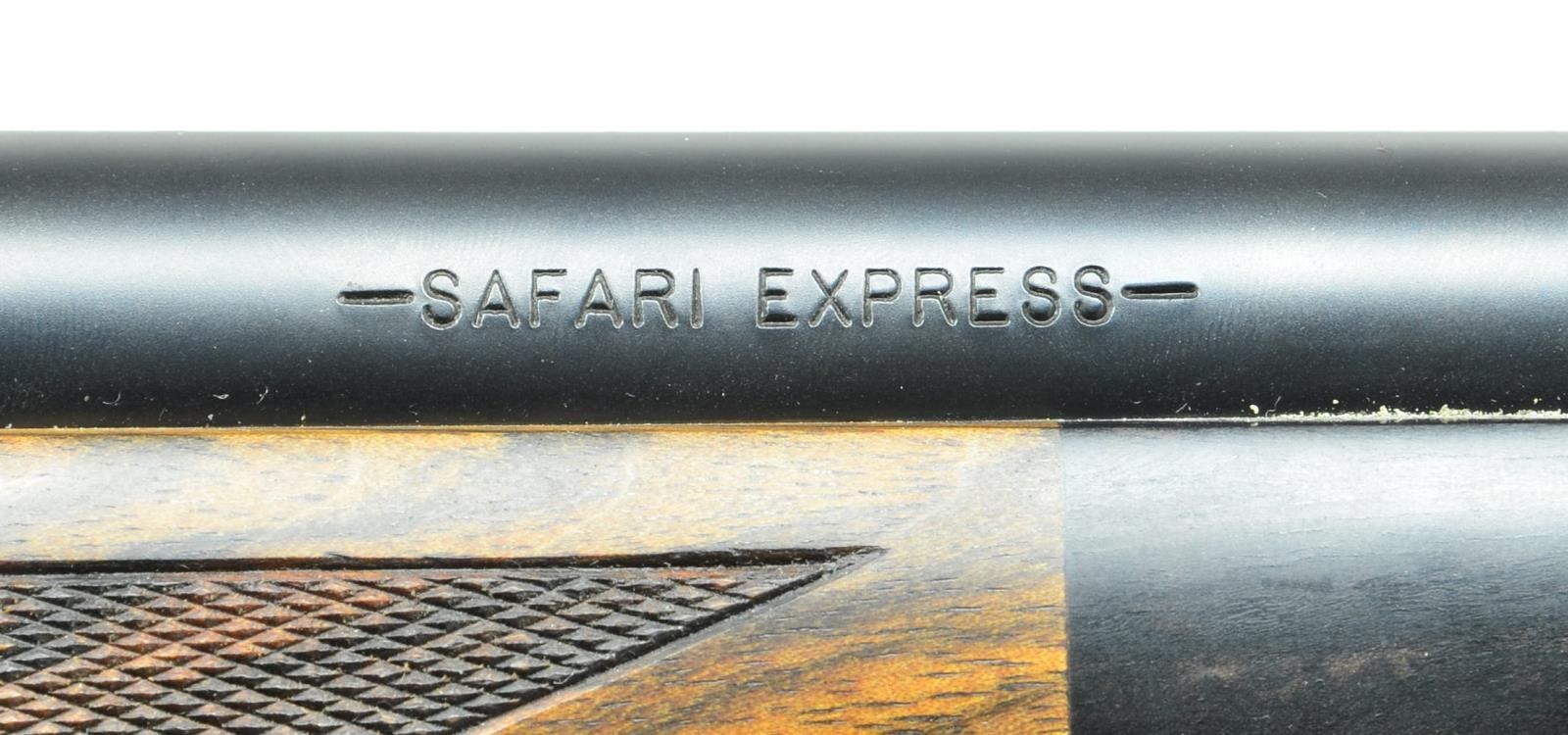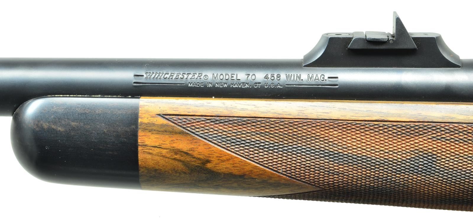 EXPRESS DANGEROUS GAME RIFLE WITH LEUPOLD SCOPE. Cal. 458 Win Mag. S# G321518. The 24 " medium weight tapered round bbl. is fitted with one standing, one folding leaf uncut rear sight in ERA island base. Gold bead front is in sleeved on ramp. Winchester nomenclature is on left side of bbl. Right is marked "-SAFARI EXPRESS-". Model 70 Classic type action with controlled feed and bbl. have fine satin rust blue. Action is fitted with standard trigger and drop box bottom metal with steel hinged floorplate and release button in bow. Attractive capped pistol grip stock of fancy marbled and lightly figured dark European walnut measures 14 1/2" over black "Decelerator" pad. Stock features swept right hand cheekpiece, ebony forend tip and gripcap, two stock reinforcing bolts with distinctive scroll engraving on heads and very well cut borderless point pattern checkering at grip and around forend. Rifle is mounted with Leupold Vari-X 7 1.5-6 scope in Leupold rings and bases with duplex reticle. Scope is fitted with storm covers. CONDITION: exceptionally fine, appears essentially "as new" with scant evidence of ever having been fired. There are only one or two exceptionally light handling marks in wood. Bolt shows some operation marks. Bore is bright and shiny. Mechanically fine. Scope is also close to new. (22-5229/MGM). MODERN. $4,000-7,500.