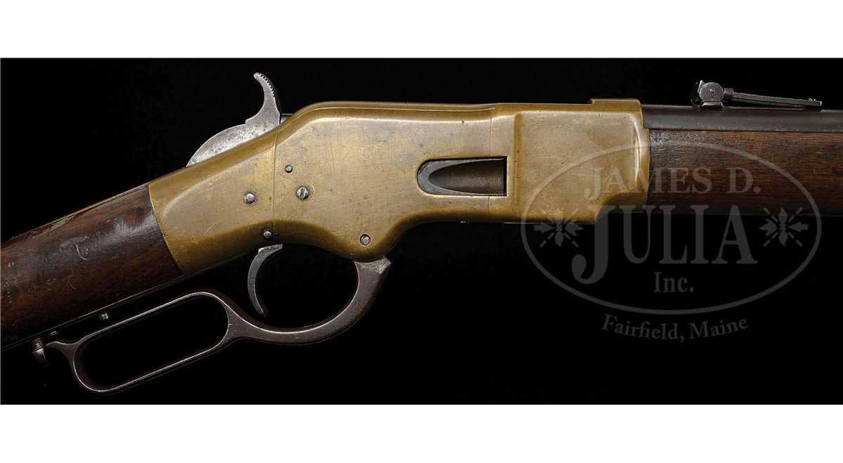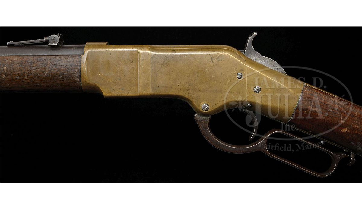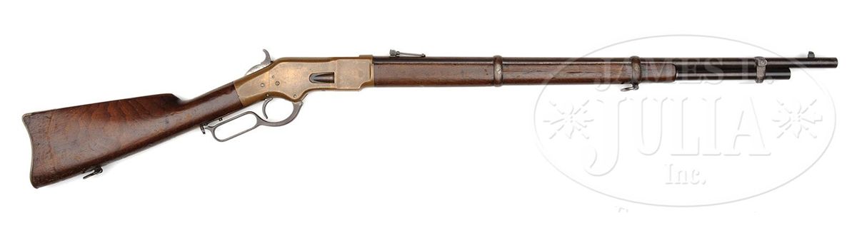 PLEASE NOTE (10/2/13): Stock and buttplate are old replacements. Stock is not numbered and buttplate has mismatched number. SN 41505. Cal. 44 RF Henry. Standard musket with 27" rd bbl, full magazine & square base front sight with 900 yd Henry style ladder rear sight. Mounted with uncheckered straight grain American walnut with 3/4" length forearm and straight stock with brass carbine/musket buttplate with trap. Rifle has 3 bands and has a saber bayonet lug on the upper band & sling wire on the middle band. Bottom of the stock has a corresponding factory sling swivel. Saber bayonet lugs on Model 1866 Muskets are somewhat rare with the bayonets for them even more rare. Winchester had hoped to get large military contracts for this musket & although the government did buy a few the large contracts never materialized. Muskets remained in production right through the end of this model with most being sold for Guard & Security forces. Turkey did buy a few of them to arm their military but never followed through with a large contract. CONDITION: Good to very good. Bbl, magazine tube & appended steel fittings retain a smooth, even brown patina. Middle and lower bbl bands have had their screws replaced with pins. Receiver & buttplate show moderate wear with light nicks & scratches and retain a wonderful dark mustard patina. Top of the receiver ring has a small casting flaw. Wood is sound showing heavy use with nicks, scratches & bruises. Buttstock retains most of an old restored finish. Forearm has a long scratch down the right side & retains a dark hand worn patina. Mechanics are fine. Strong bore with good shine and light pitting. 4-47638 JR146