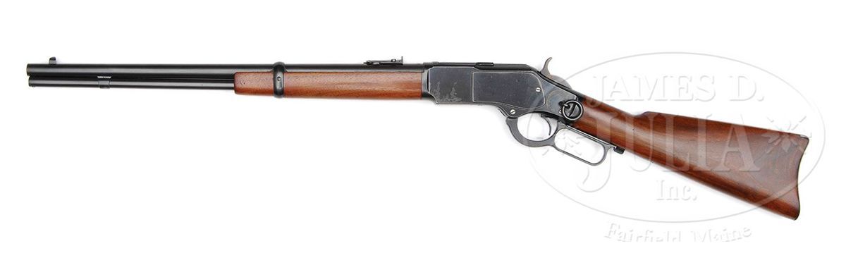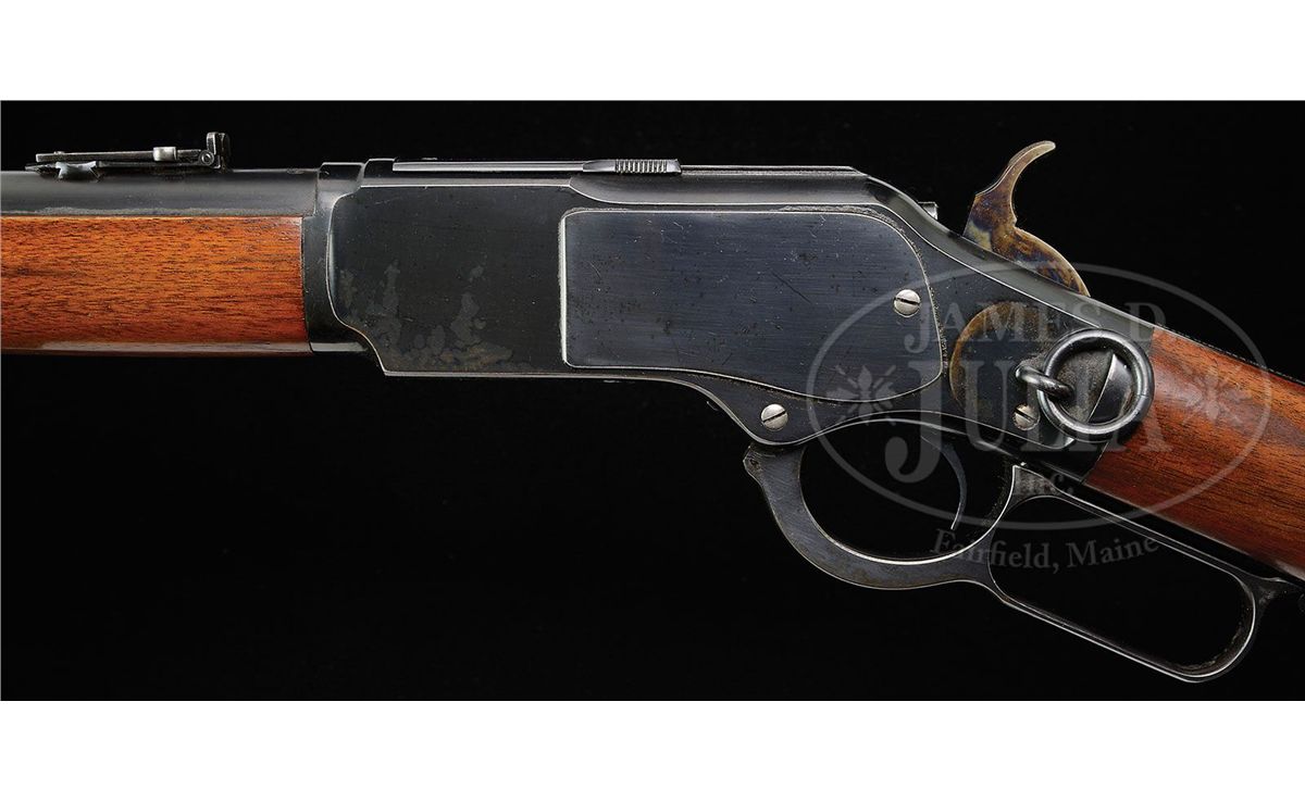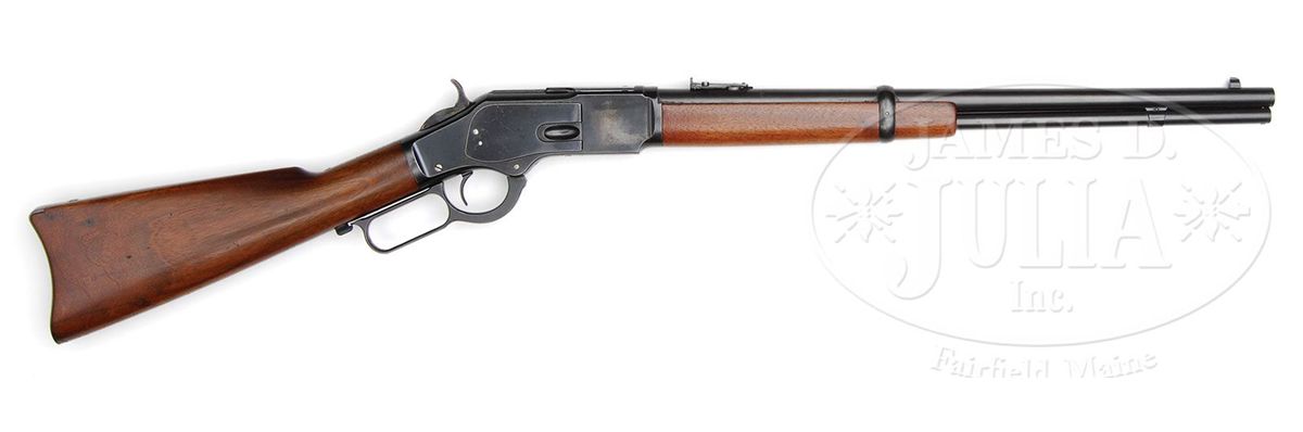 SN 708403. Cal. 32 WCF (32-20). Standard grade carbine, fairly scarce in this caliber, with 20" bbl, full magazine, barleycorn front sight and 2,000 yard carbine ladder rear sight. Left side of receiver has a staple & ring. Mounted with nicely figured, uncheckered American walnut with straight stock and carbine buttplate without trap. Accompanied by a Cody Firearms Museum letter which identifies this carbine, as found, received in warehouse Nov. 7, 1916 and shipped May 10, 1917 to Simmons Hardware Co., St. Louis, MO. The fact that this letter shows a shipping destination is quite rare for a Winchester. Simmons Hardware was a major supplier to western dealers and folks moving west. PROVENANCE: Wes Adams Estate Collection. CONDITION: Extremely fine. Bbl & magazine tube retain about 99% crisp orig blue with a few tiny nicks on the magazine tube; receiver retains 96-97% crisp orig blue with only very light sharp edge wear and some light chemical spotting on left front flat; hammer retains about all of its brilliant case colors and the lever about all of its orig blue; buttplate retains 95-96% orig blue. Wood is sound with a very few, very minor handling & storage nicks & scratches and overall retains virtually all of its orig factory finish. Mechanics are crisp, bright shiny bore with some minor roughness, has been fired but very little. This is a fine example of an 1873 carbine in 32 caliber. 4-44596 JR45