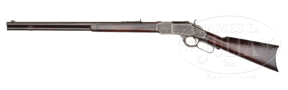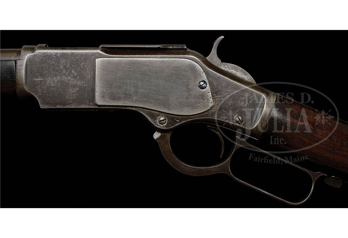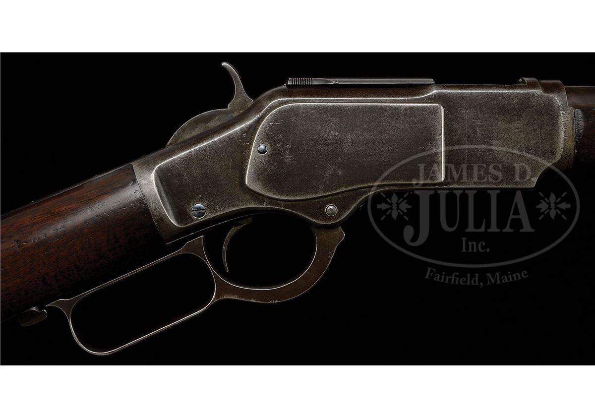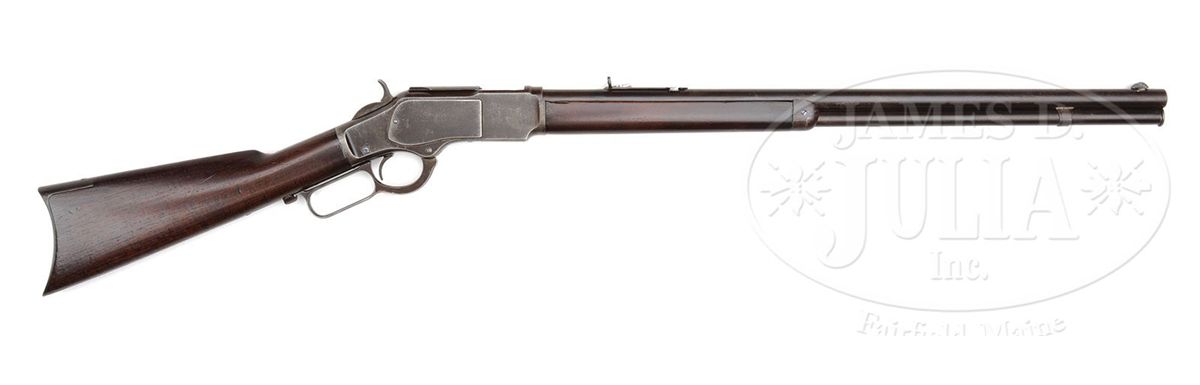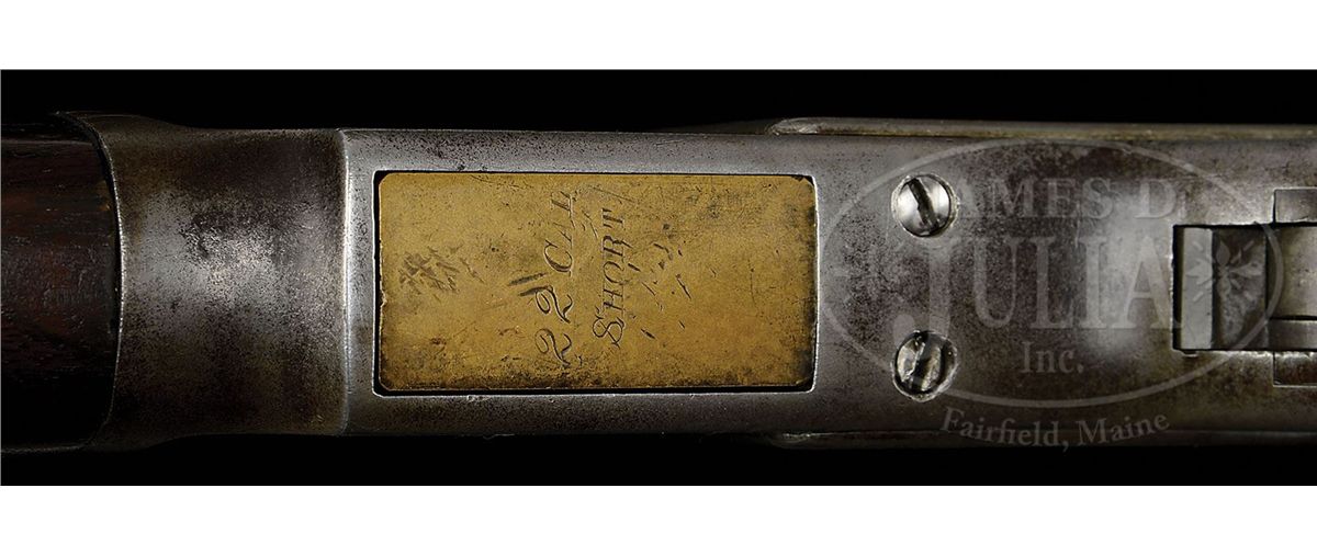 SN 296949. Cal 22 Short. Standard grade rifle with 24-1/4" rnd bbl, full magazine, Lyman ivory bead hunting front sight & semi-buckhorn rear sight. Mounted with uncheckered straight grain American walnut with straight stock & crescent buttplate without trap. Bottom of the carrier is marked "22CAL/Short". Inside magazine tube is original. This model was the first repeating 22 rifle manufactured in the U.S. According to Flayderman's Guide to Antique American Firearms, there were about 19,522 of these rifles manufactured in the period 1884-1904. Although these rifles are full sized they were considered to be "boys" rifles and were treated accordingly, usually showing hard use with little maintenance. Small bore firearms of that era were very difficult to clean and consequently bores of these rifles are usually not good. CONDITION: Very good. No orig finish remains with bbl & magazine tube showing an artificially aged patina with dressed out wrench marks on the bbl over the chamber area. Receiver retains a mottled silvery brown patina with a few small nicks & dings. One timing screw is a replacement & another is battered. Some of the receiver screws are also replacements. Wood is sound with a repair in the forearm and with a few minor nicks & scratches and retains a restored finish. Mechanics are fine. Worn, dark bore. 4-48622 JR118