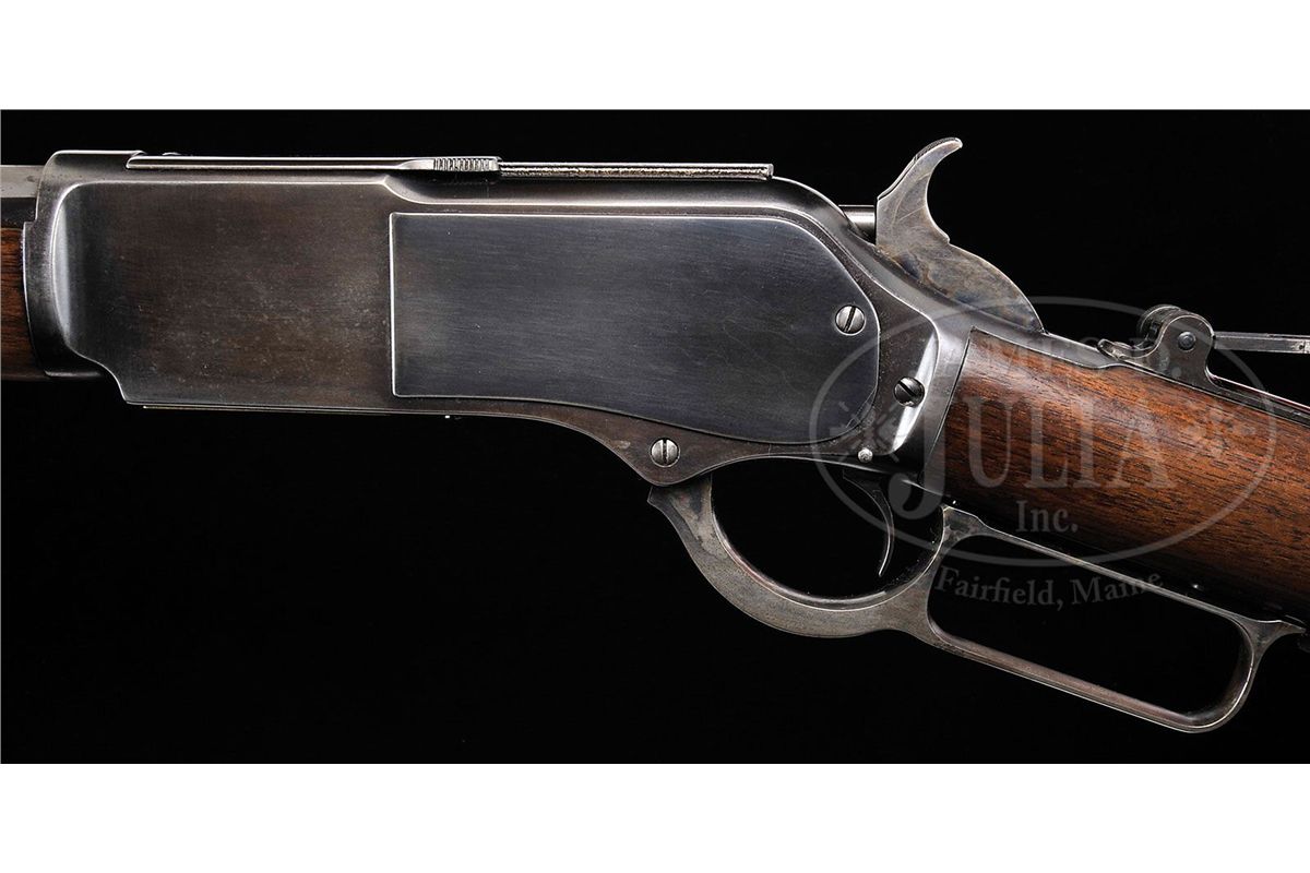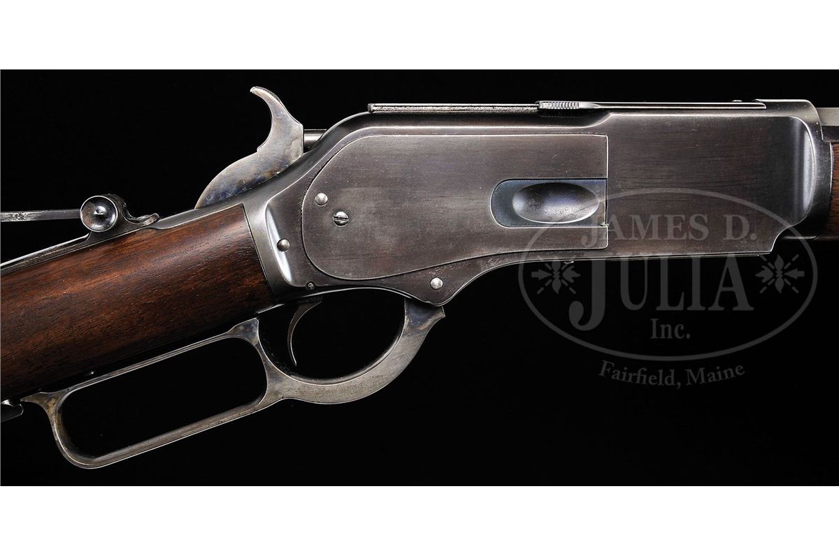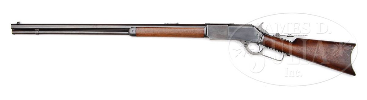 PLEASE NOTE (02-21-13): As noted the bbl is the rarer 28" version not the standard 26". SN 13363. Cal. 50-95 Express. Standard grade rifle with 28" oct bbl, full magazine, half nickel front sight, 3-leaf platinum line express rear sight and mid-range tang sight with 4" staff. Mounted with uncheckered, straight grain American walnut with straight stock & crescent buttplate with trap containing a 4-pc orig brass & steel cleaning rod. Receiver is 2nd Model with screwed-on dust cover rail and dust cover that is marked "WINCHESTER EXPRESS / .50 CAL. 95 GRS." Accompanied by a Winchester Gun Museum letter which identifies this rifle in caliber 50 Express with 28" oct bbl and plain trigger shipped July 31, 1881. Model 1876 rifles were the lowest production of Winchester's lever actions seeing only 63,871 produced in the period 1876-1897. Of that limited production the Big 50 caliber is the most rare with not many produced in comparison to the smaller calibers. 50-95 rifles are very seldom encountered today. The cartridge was designed as an improvement over the venerable 50-70 Military cartridge but given its brutal recoil it did not prove terribly popular and was used primarily as a big game cartridge for animals such as bear, moose & elk. It is well recorded that Theodore Roosevelt owned & used a deluxe 1876 rifle chambered for the 50 caliber express. CONDITION: Fine to very fine. Bbl retains about 70-75% blue turning a little plummy with some chemical streaking on the upper 1/3 and over the chamber area; magazine tube retains a thin plummy blue patina with some minor chemical streaking and some light discoloration; receiver has been lightly cleaned, probably with steel wool but retains a smooth thin blue turning a little plum with strong blue in sheltered areas; hammer retains bright case colors and the lever bright case colors on the sides and in sheltered areas. Wood is sound and has been lightly refinished. Mechanics are fine, strong, sharp bore with light pitting. Consignor states this was an outstanding shooter. Cleaning rod is fine. 4-47710 JR259