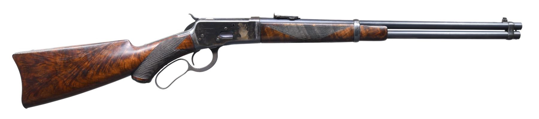 LEVER ACTION SRC. Cal. 44 WCF. S# 784326. Bbl. 20" round. Pinned blade front sight w/ folding leaf carbine rear sight. Full length mag. Blue finish Action has saddle ring on left side. Carbine forend & hard rubber capped pistol grip stock of XXX fancy black walnut w/ steel carbine buttplate. Style H factory checkering. Left inside of lower tan is stamped w/ wood grade marking XXX followed by assembly number 814. Top tang channel of stock has matching number 814. Mfg. 1915. CONDITION: bbl. & mag. tube have over 90% lightly faded original blue showing spots of freckling. Action retains 70% lightly faded blue showing edge wear w/ balance having flaked to brown. Unsanded wood has added coat of finish showing grain checks in butt. Checkering appear to be lightly freshened. Bore retains strong rifling. (25-1304/DS). CURIO. $2,500-4,000.