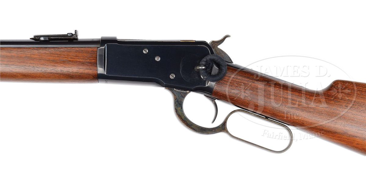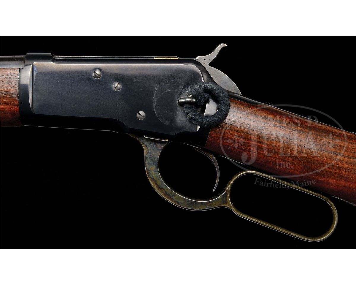 SN 135094. Cal. 44 WCF. Fine antique '92 carbine with 20" rnd bbl, full magazine, square base front sight with German silver blade & 900 yd. carbine ladder rear sight. Left side of receiver has a staple & ring. Ring is covered in cloth. Mounted with uncheckered, straight grain American walnut with straight stock & carbine buttplate. This carbine was made in 1896 at a time when the cowboy was king and the west was still a little wild. Most business was conducted from the back of a horse or wagon, which exposed these firearms to harsh conditions, usually with little maintenance. Finding a carbine in this condition from that era is an extreme rarity. PROVENANCE: Woody Frey Collection. CONDITION: Extremely fine plus. Appears to be pristine, new and unfired with a crisp, bright blue, brilliant case colors and bright orig finish. 4-48455 JR217