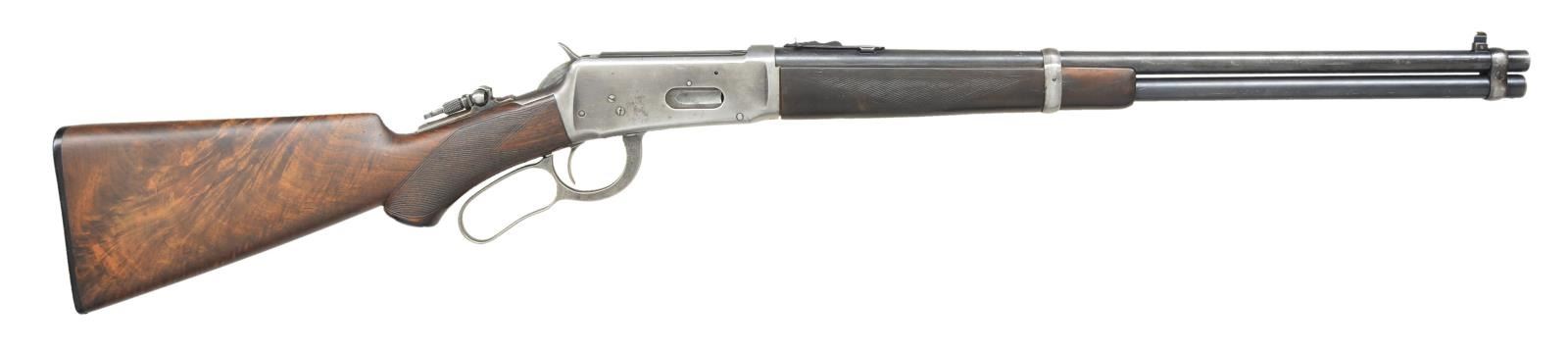 LEVER ACTION SRC. Cal. 30 WCF (30-30). S# 258722. 20" Carbine barrel. Replacement marbles gold bead pinned blade front sight, replacement Rimfire style rear sight with combination tang sight. Left side of action has replacement style saddle ring. Long wood forearm & small hard rubber capped pistol grip stock of XX fancy walnut with style "H"H factory checkering & hard rubber shotgun buttplate. Left side of lower tang is marked with assembly number "20043" followed by wood grade marking "XX" Top tang channel of stock is stamped with matching "20043" assembly number & "94". Mfg. 1902. CONDITION: barrel & mag. tube retain 60% dull lightly faded blue. Action retains so dull blue on side & in protected areas fading to gray. Lever & hammer show traces of case colors. Sanded & refinished wood have age darkened appearance & weakened Checkering. Bore retains strong rifling. (22-3983/DS). CURIO. $1,500-2,500.