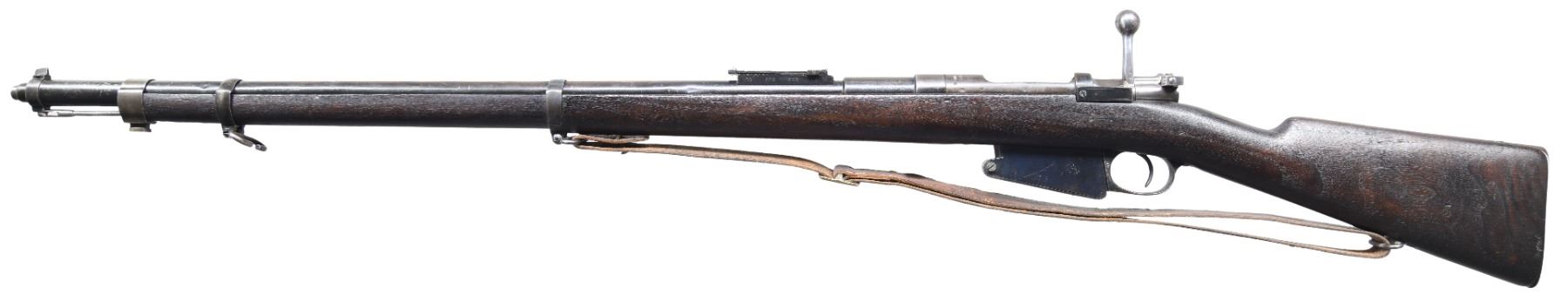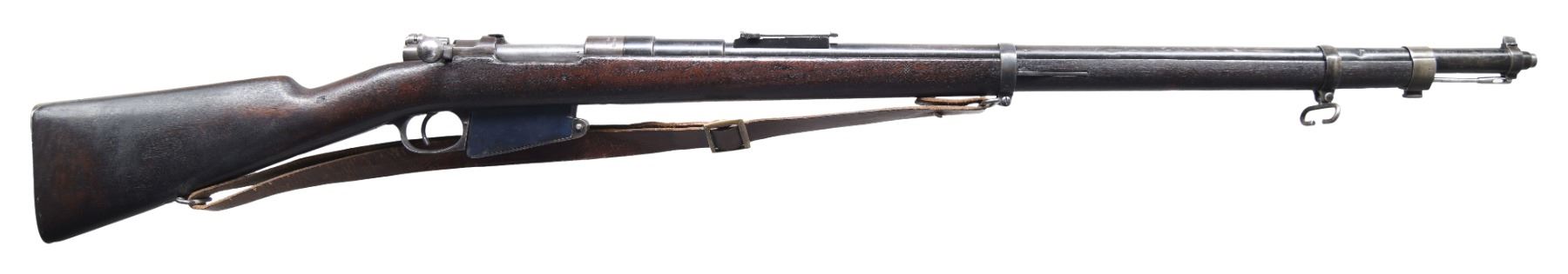 BOLT ACTION RIFLE. Cal. 7.65mm (7.65 Argentine). S# 4927f. Bbl. 30 1/2" with jacket. Blade front sight. Ladder rear sight graduated to 1900m. Buttplate & bolt are matching as-arsenal renumbered. Stock number is faint but appears to match. Mag is an Argentine 1891 replacement & has an added number that matches receiver. Bbl. jacket & rear sight are mismatched. Scarce Marlin-Rockwell assembled WW1 Belgian Mauser rifle using H&A parts after the latter's bankruptcy. Metal is mix of arsenal blue & black enamel finishes. Walnut stock set with bottom mounted sling swivels & leather sling. Cleaning rod present. Rifle has added interwar band with stacking hook. CONDITION: stock has arsenal rework appearance with added dark oil finish, some chipping behind upper tang, a further chip at front of cleaning rod channel, some flaking, scattered dings & handling marks. Metal retains 50% finishes with scattered flaking enamel on bbl. jacket, some moderate dents on bbl. jacket, a spot of touch up blue over an expert repair on left side of front sight assembly, a few spots of light pitting, some dings, & scattered fading to gray. Mag body not fitting well & may require attention to function. Bolt functions properly when hand cycled. Very good bright bore with some light frosting but strong rifling. (25-223/MJC). CURIO. $600-900.