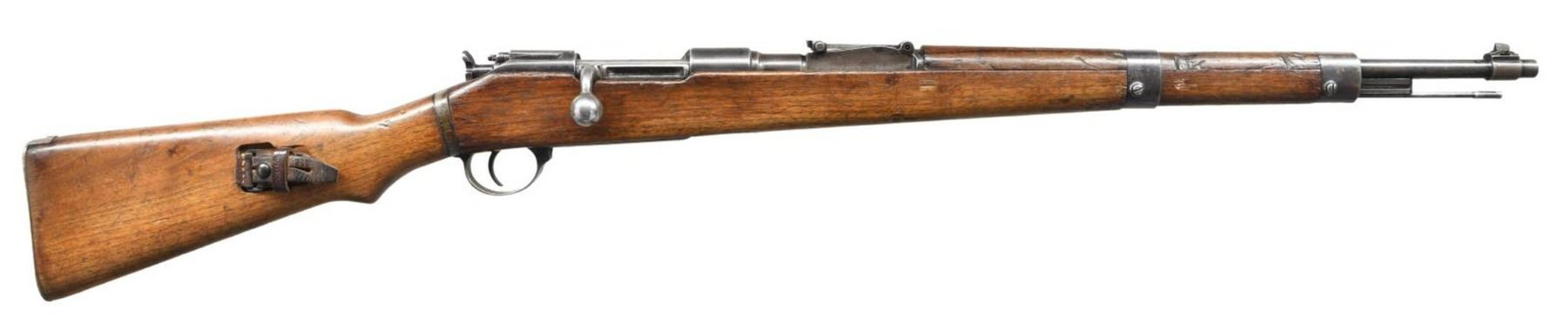 Cal. 8mm Mauser. S# 4433v. Bbl. 24". WW2 G98/40 rifle produced in Hungary by FEG for German army. Mismatched numbers throughout. Bolt body appears unnumbered & may have been scrubbed. Top of receiver has German eagle over "173" Waffenamt, "jhv" for FEG factory & 43 date. Tangent rear sight graduated to 2000m. Blade front sight. No sight hood present. Walnut stock set w/ left side sling provisions & leather sling. Rear sling swivel appears bent & front band pin extends outward. Stock has a faint Eagle "173" Waffenamt on wrist & jhv stamp on bottom of butt. Cleaning rod present. CONDITION: walnut stock set has a few gouges, scattered dings & handling marks. Metal is mostly a silvery gray patina w/ scattered oxidation staining & traces of original blue. Worn pitted bore. (23-1961/MJC). CURIO. $1000-1500.