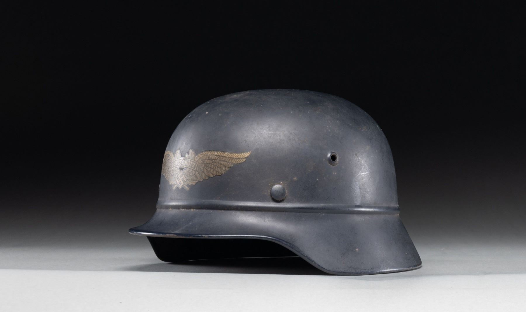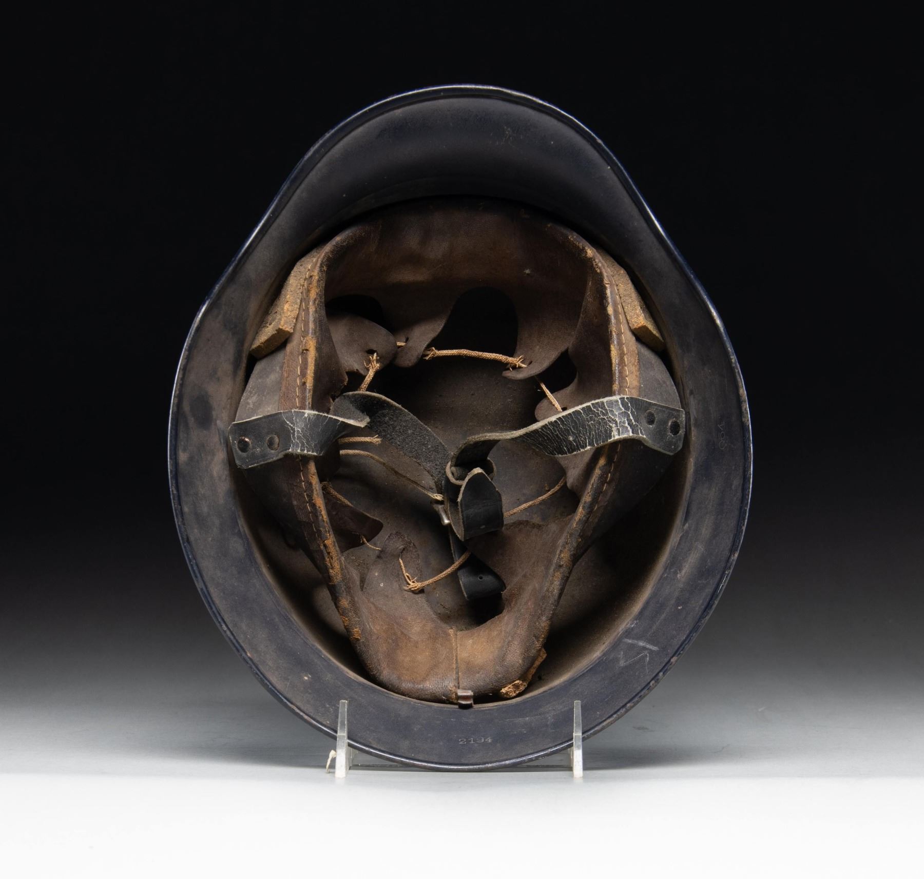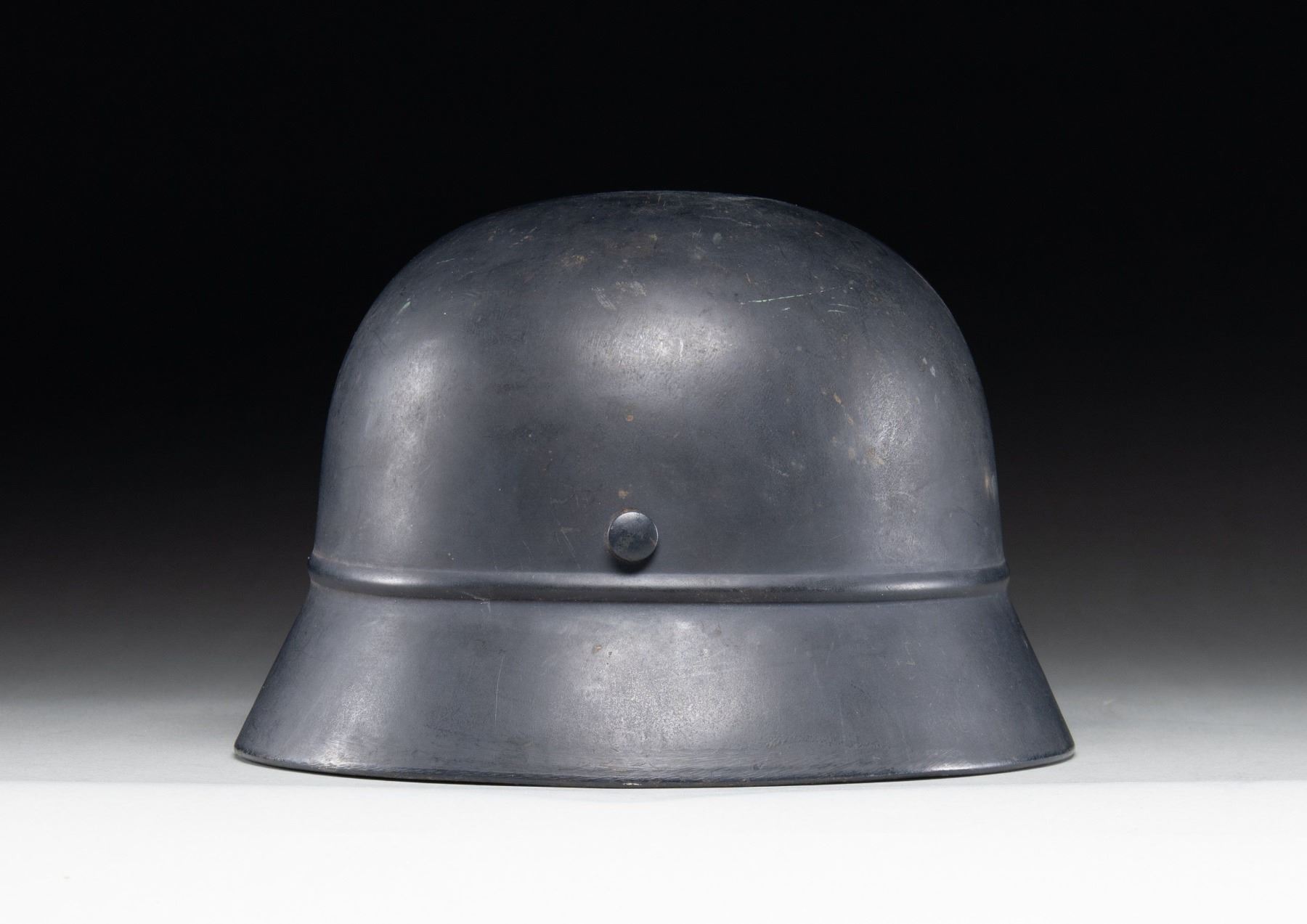 A scarcer example of a WWII German beaded M1935 Luftschutz helmet in dark blue paint with a large winged Luftschutz decal on the front. Inside rear is stamped "2194" and the inside left is stamped "Q64". Full liner and chinstrap. CONDITION: helmet finish and decal are nearly 100%. Liner is a bit misshaped and dry, but complete. (02-24871/BF). $300-500.
