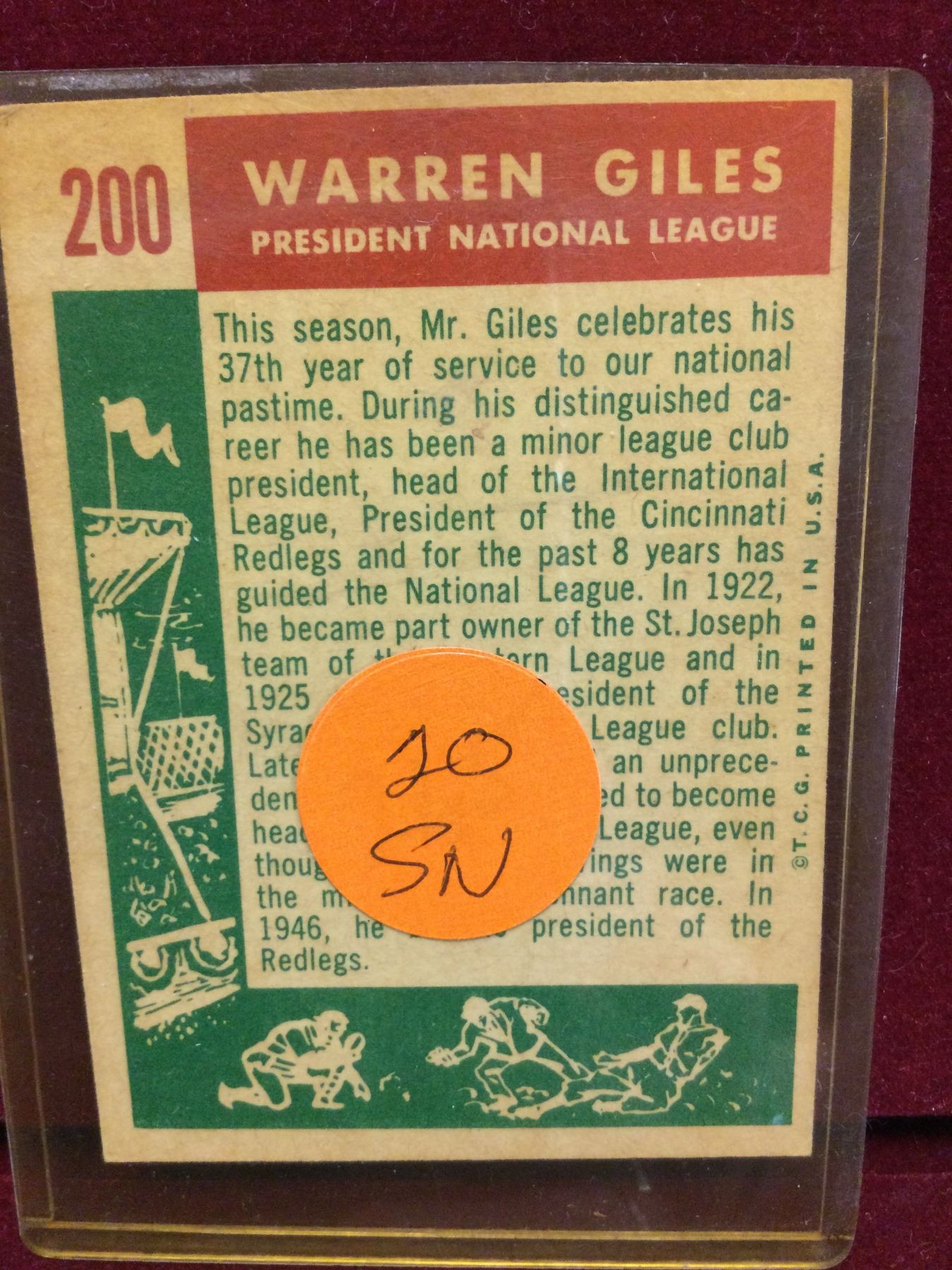 You are bidding on a Warren Giles President of the Nat'l League Baseball Card, a highly desirable and collectible card