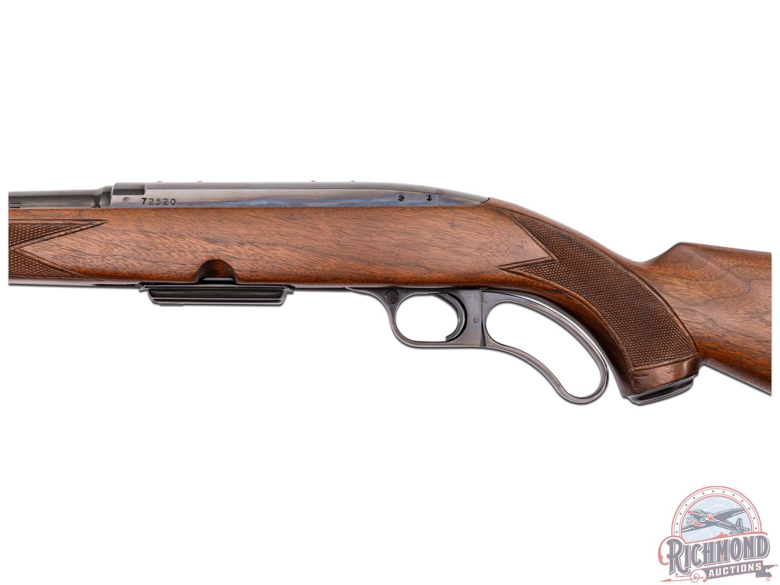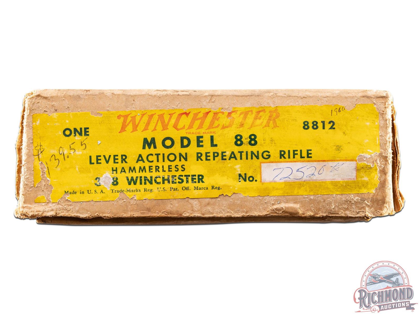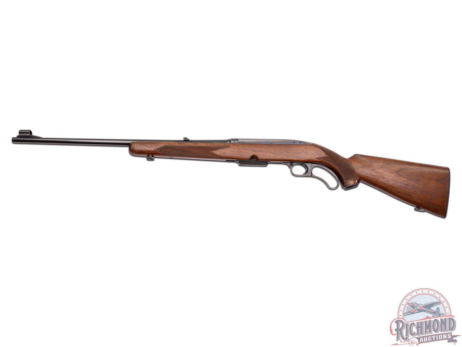 This model 88 was manufactured in 1958. Features a 22" blued tapered Winchester Proof Steel barrel with all standard factory roll marks and proof marks. Chambered in the rare 358 WIN caliber. Hooded front ramp sight and rear flip-up notch sight with white diamond insert. Blued receiver drilled and tapped for scope mount. Unique lever that actions with the trigger and crossbolt safety. Includes original factory detachable magazine. Satin walnut stock with hand checkered pistol grip, metal pistol grip cap, and matching checkered forearm. Fitted with a factory synthetic butt plate and swivel sling rings. Includes the original factory box with hanging tag. LOP: 13-3/4". CALIBER: 358 WIN. S/N: 72520. FFL STATUS: Curio & Relic.