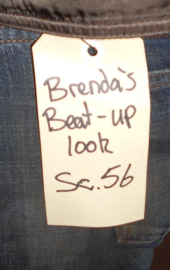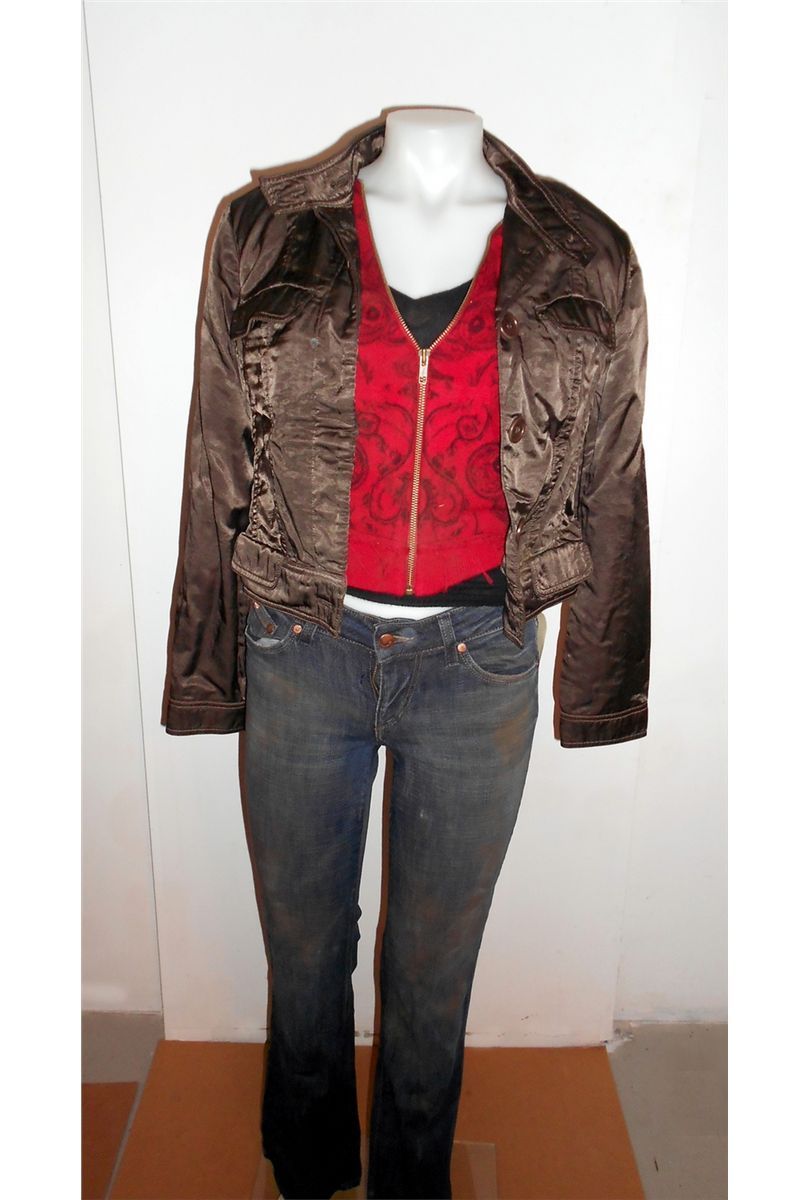 The "Club Monaco" brown jacket is a size M and has a button front. The outer shell of the jacket is made from silk like material. It has a button collar and cuffs. The red cashmere sweater has no size indicated and a black Victorian print. There is a zipper front and a frayed look around all the cuffs. It also features a hood with drawstring. The "Joe's Jeans" blue jeans are a size 26 and feature a zipper and button fly.The "Juicy Couture" black cashmere shirt is ribbed and has no size indicated. The black tank top has no size indicated and a v-neck design. It features shoulder straps and there is a small hole near the neckline. The wardrobe tag reads "Brenda's beat-up look sc. 56"