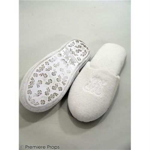 This Hero costume is worn on screen by Cindy (ANNA FARIS) in the hilarious comedy "Scary Movie 4!" The "Oscar de le Renta" pale yellow silk robe is a size small. It has pink roses and a green polka dot print. It features waist ties and a patterned sash. The white terry cloth slippers are a size 7 and are scuffed. They have a closed toe with a white monogram on it. This outfit includes two costume department wardrobe tags and is clearly seen worn on screen by Cindy during "The Grudge" stairway spoof sequence! Authenticity is Guaranteed! A perfect addition to your movie memorabilia collection! (4SM1004).