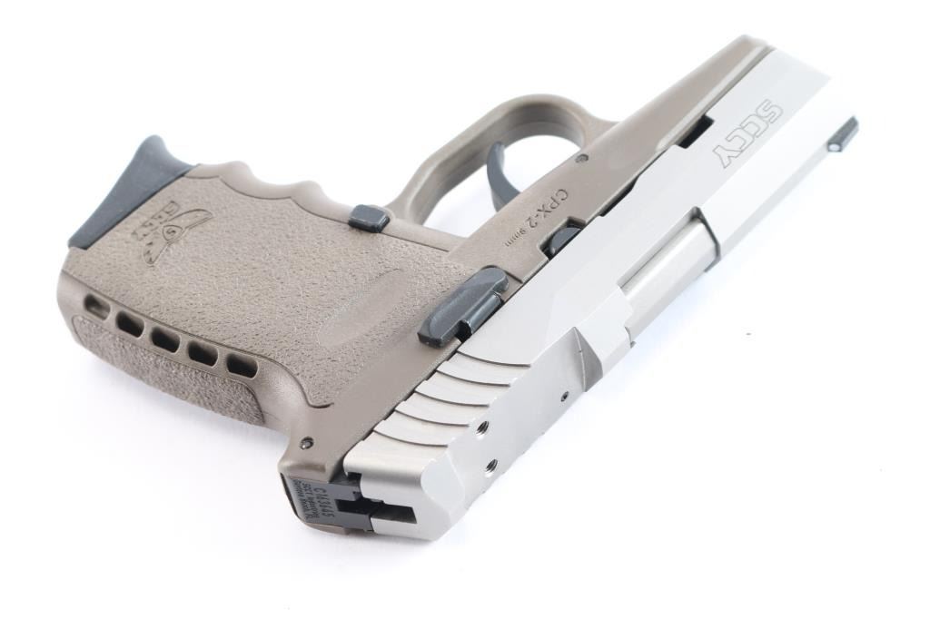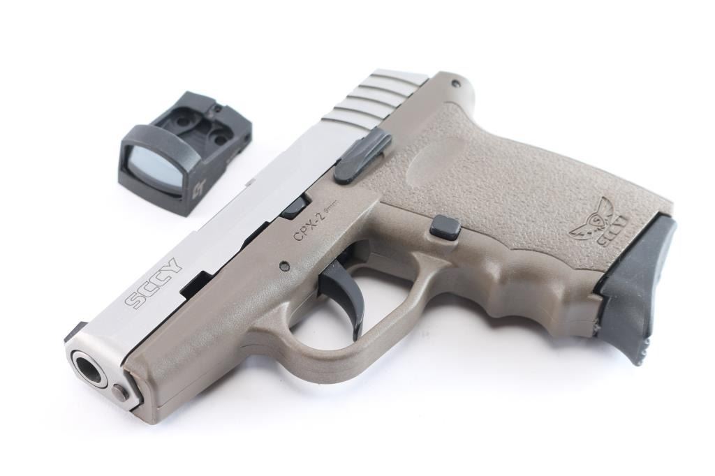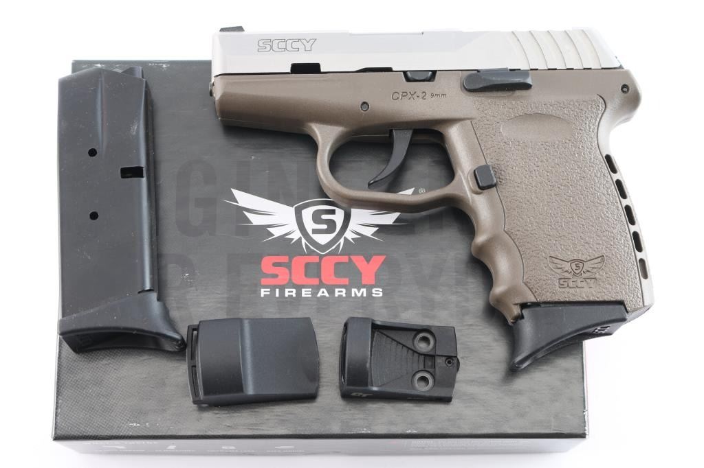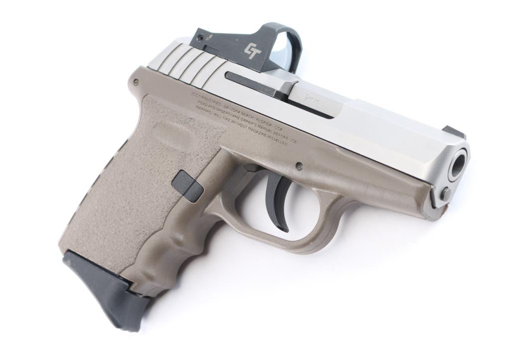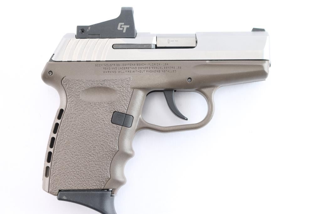 American made compact hammer-fired double-action-only pistol chambered for 9x19mm. Pistol features a 3" barrel, fixed blade front sight with white dot, optics cut slide, aluminum insert (receiver) with full length guide rails, full-length metal guide rod with dual recoil springs, matte stainless steel slide finish, smooth push-button magazine release, smooth slide stop, and textured 'Earth' polymer frame with finger grooves. The oiginal stainless steel finish retained is approximately 99% with nothing remarkable. Metal displays no rust or deformation. Bore is bright with strong rifling. Polymer grip module is also in excellent condition. Comes with original factory cardboard box, owners manual, sticker, Crimson Trace CTS-1500 red dot, battery, two magazine floorplates, tools, lock, and two magazines total.
