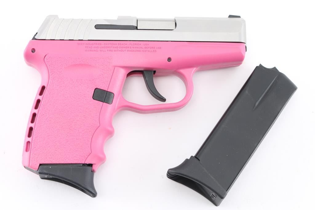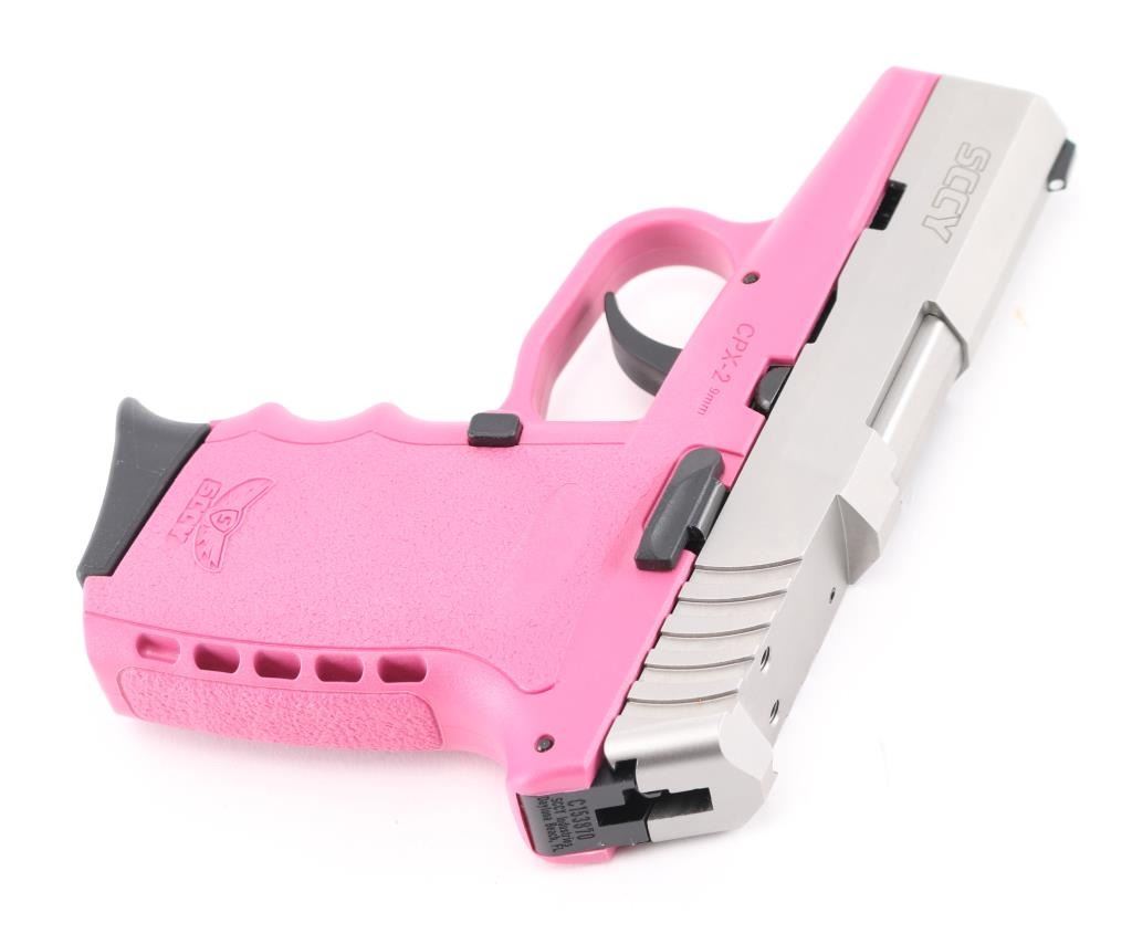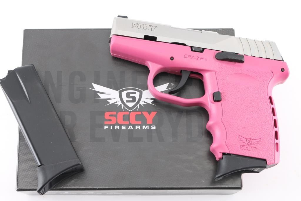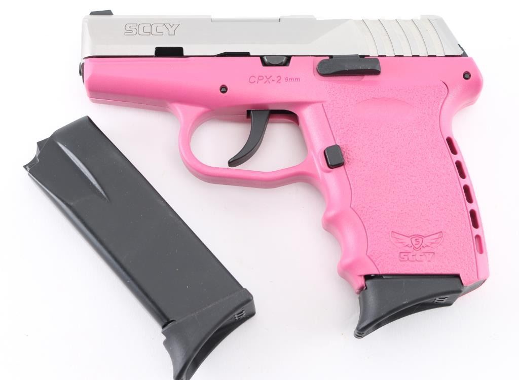 Made in America, the CPX-2 is a compact, hammer-fired, DAO pistol chambered in 9mm. It features a 3" barrel, stainless steel slide, pink polymer frame, dot white sight, a CT rear optic sight is included in the box with hardware, tools, and battery (needs to be attached}. A 9lb trigger pull. Metal finish looks great, frame looks great. Bore is excellent. Overall gun looks near new. Comes with original factory cardboard box, owners manual, lock and two (2) magazines. Condition is NRA Excellent.