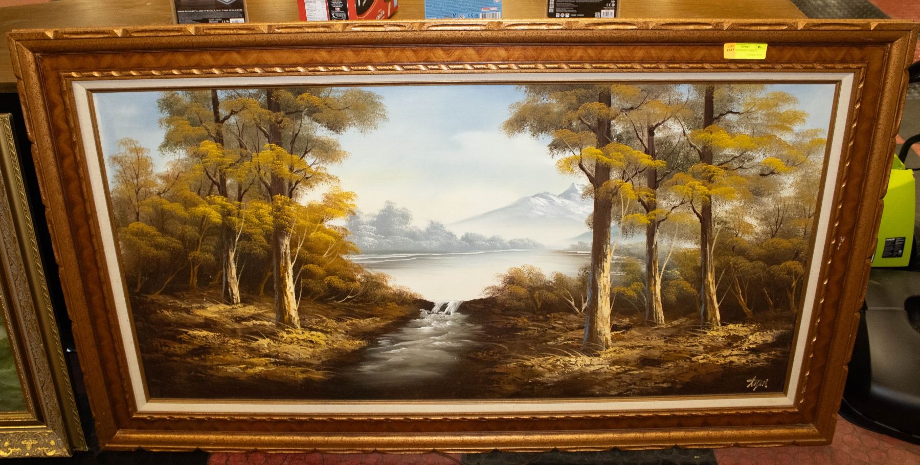 SCENIC MOUNTAIN, FOREST PAINTING 56" X 32"