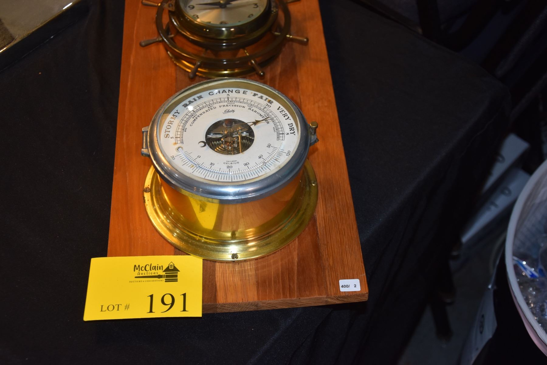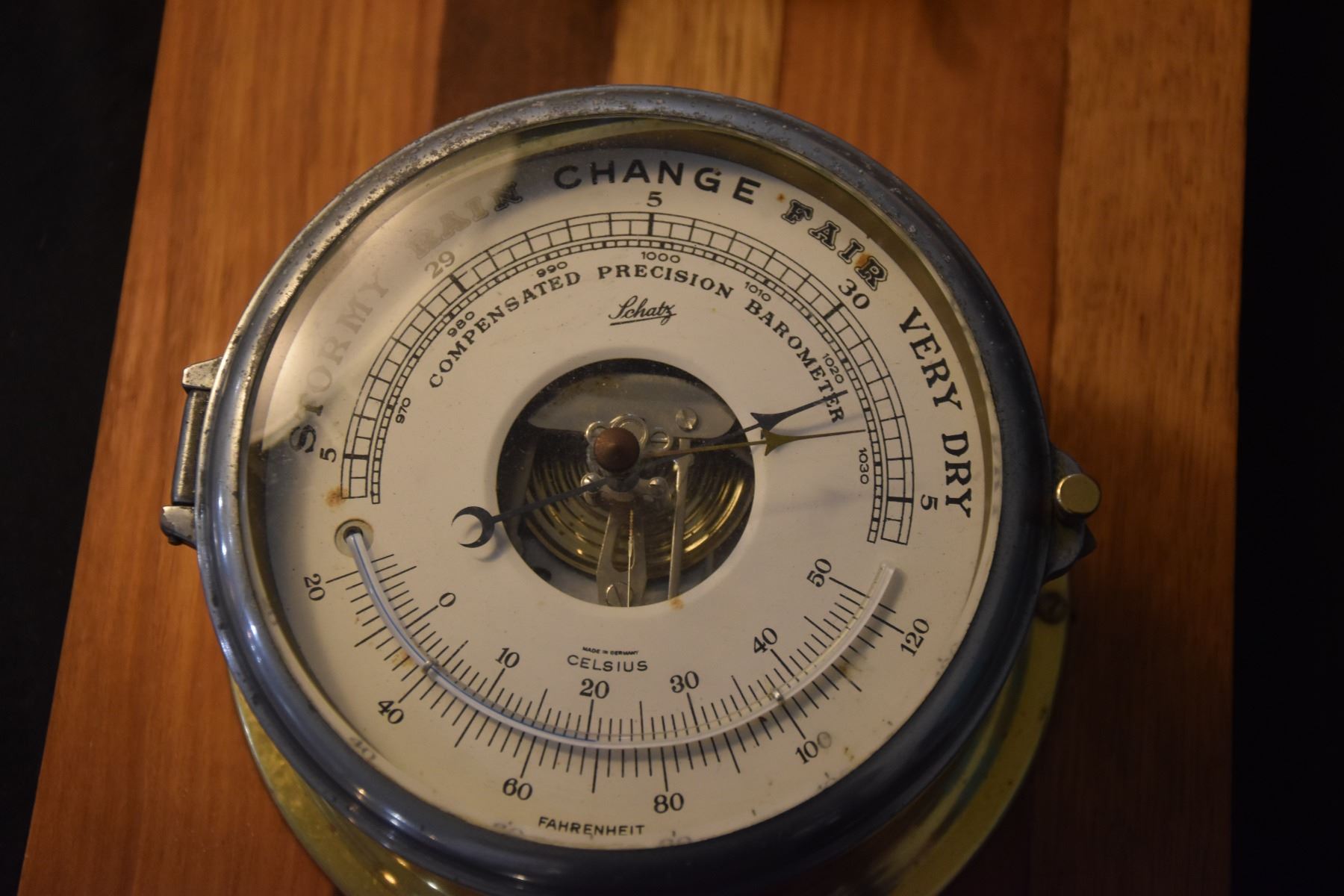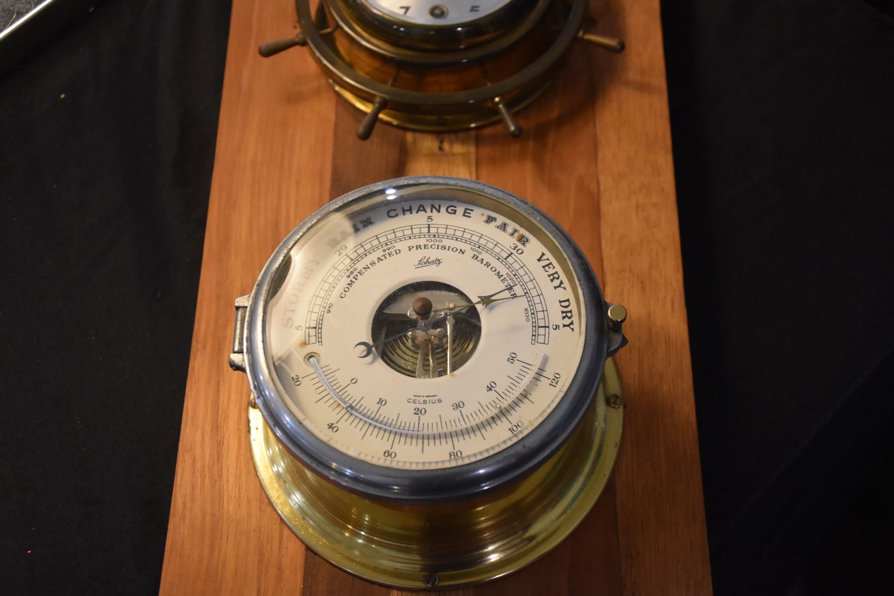 SCHATZ BAROMETER & CLOCK MOUNTED ON WOOD PLANK