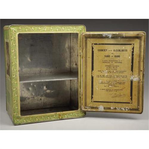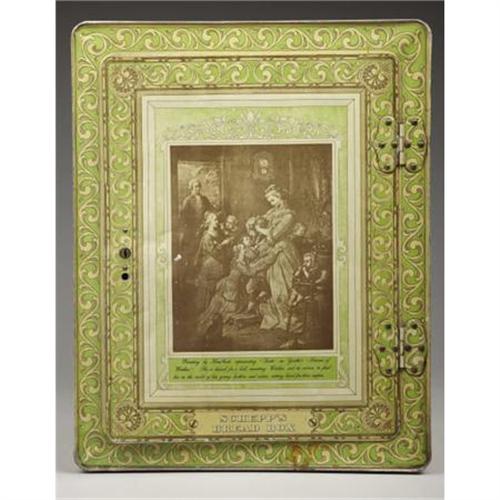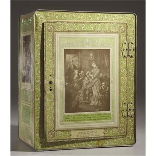 <B>“SCHEPP'S BREAD BOX”</B></I> - Advertising for Schepp's Coconut; 15½” x 10” x 20” tall printed tin; vented; graphics of fine European paintings on 3 sides; 1 shelf; early 20th century.<BR><BR><B>Condition: </B></I>Very good overall<BR><BR><b>Shipping:</b> Miscellaneous Collectibles, Larg (<a target="_blank" href="http://www.heritageauctions.com/common/shipping.php">view shipping information</a>)