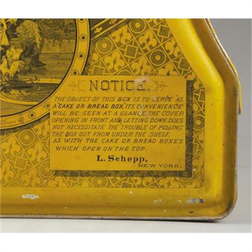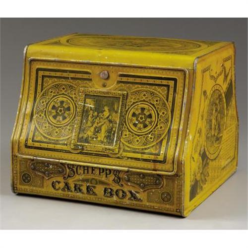 <B>“SCHEPP'S CAKE BOX”</B></I> - Advertising for Schepp's Coconut; Little tin box by Somers Brothers, Brooklyn, New York; yellow with black; 12” x 11½” x 9½”; great graphics of master paintings. <BR><B>Condition: </B></I>Overall very good condition.<BR><BR><b>Shipping:</b> Miscellaneous Collectibles, Larg (<a target="_blank" href="http://www.heritageauctions.com/common/shipping.php">view shipping information</a>)
