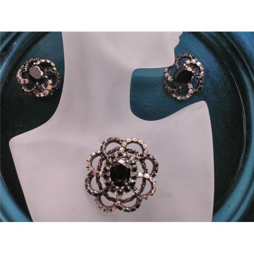 Vintage Schiaparelli "Midnight Madness" Black jet glass and aura borealis rhinestones combined to create an alluring brooch and earring set that is both mysterious and provocative. I love the combination of the bleakness of the black glass cabochon centers highlighted with magical swirls of new light energy. A wonderful contradiction and an exceptional demi-parure by Elsa Schiaparelli.<p>Measurement: Brooch: 2" Diameter; Earrings: 1-1/4" Diameter (Clip Backs)<p>Setting is in excellent condition with original set stones. Circa: Post 1948.