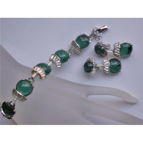 Sensational is the only word for this stunning Emerald Color Venetian Glass Schiaparelli Dinner set. It is a true piece of artistry. The emerald green color venetian glass cabochon capture the light and the matrix imagery within the glass. Set in a rhodium plated silver.<p>Measurement:<p>Bracelet: 7-1/2". There are (six) 1/2" diameter emerald colored glass stones which are channel set with brilliant rhinestone baguettes. The bracelet has a interlocking clasp which is pave' set. Truly a magnificent piece. <p>Earrings: Ready for more glamor: Dangle clip back style. Length is 1-1/2", Exact design of the bracelet. Truly a collector's piece for years to come.<p>Coppola e Toppo: Lyda and Bruno Coppola, brothers and sisters created some of the finest faux-pieces in the 40's and today their pieces are considered "works of art" Before going out on their own. They supplied the beautiful gemstones for Elsa's magnificent creations.