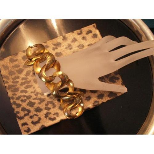 Schiaparelli has really gone wild with this spectacular simulated animal link bracelet. <p>This is an amazing and dramatic bracelet from the 1950's designed by Elsa Schiaparelli. The large open "hand forged" gold over a base metal is simply outrageous. The design is very moderne and fits perfectly in today's world. It must have been really simply shocking to wear in the 50's. Each link has been distressed, etched and accented in a black wash to highlight the simulated animal pattern. The bracelet is same on both sides and the links are asymmetrical in shape. Extremely comfortable to wear. <p>Measure: (Links) 1-1/2" Length x 1" Width Bracelet Length: appx. 8" - interlocking pressure lock. Metal tag original tag with Schiaparelli signature. Circa: Post 1948