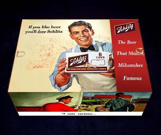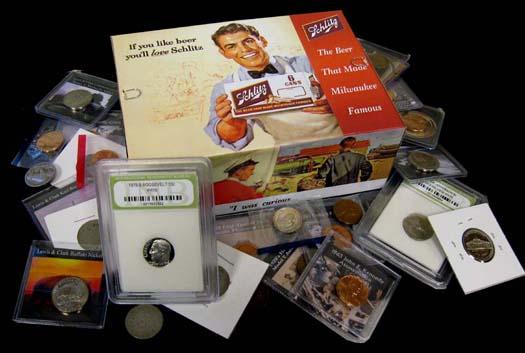 SCHILTZ BEER OLD STYLE BOX WITH OLD COIN COLLECTION