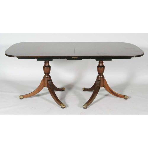 SCHMIEG & KOTZIAN DINING TABLE George III style twin pedestal stamped under runners with SK logo, 45"x72"top, 29 1/2" high with one 20" leaf, early 20th c., refinished