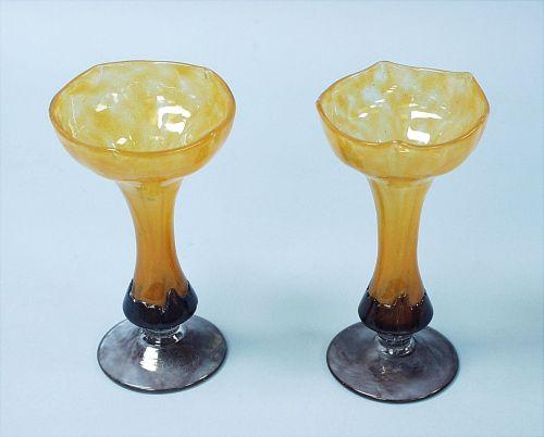 SCHNEIDER - A fine pair of vitrine size art glass vases. Each tulip form vase with fused art glass ground facetted and free moulded rim. Signed on circular base. Each 7" high.