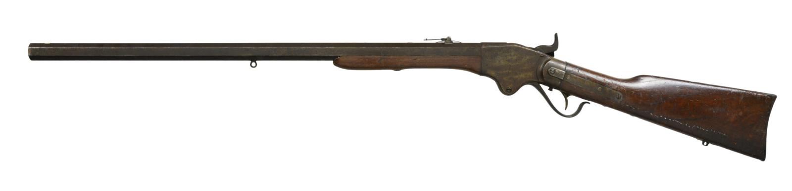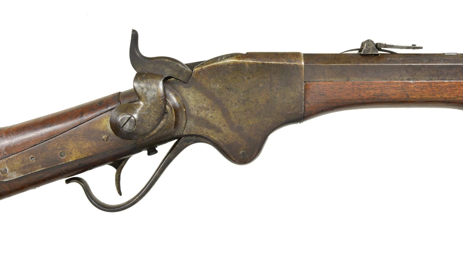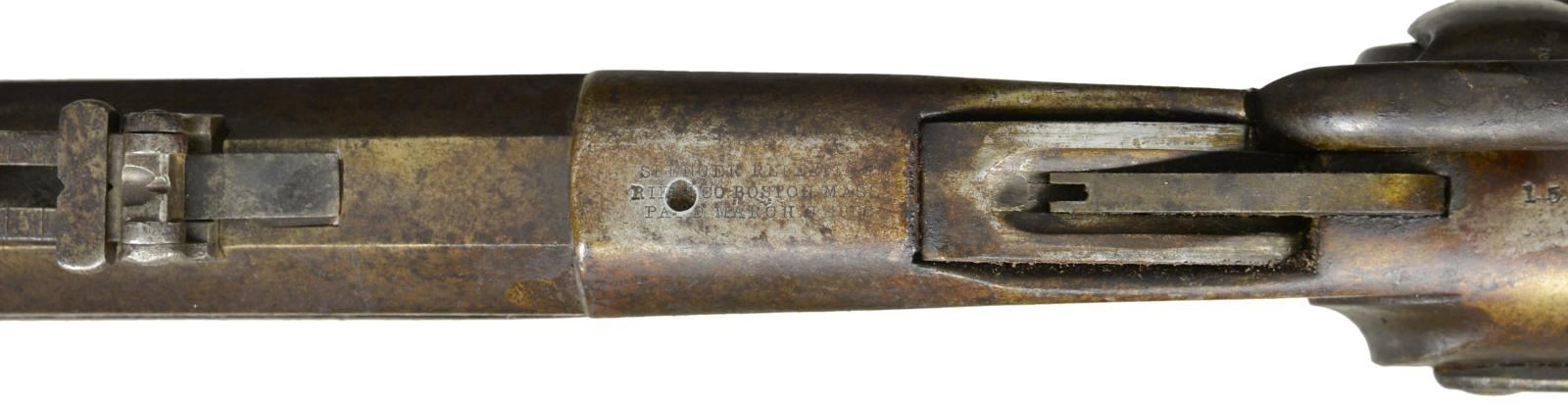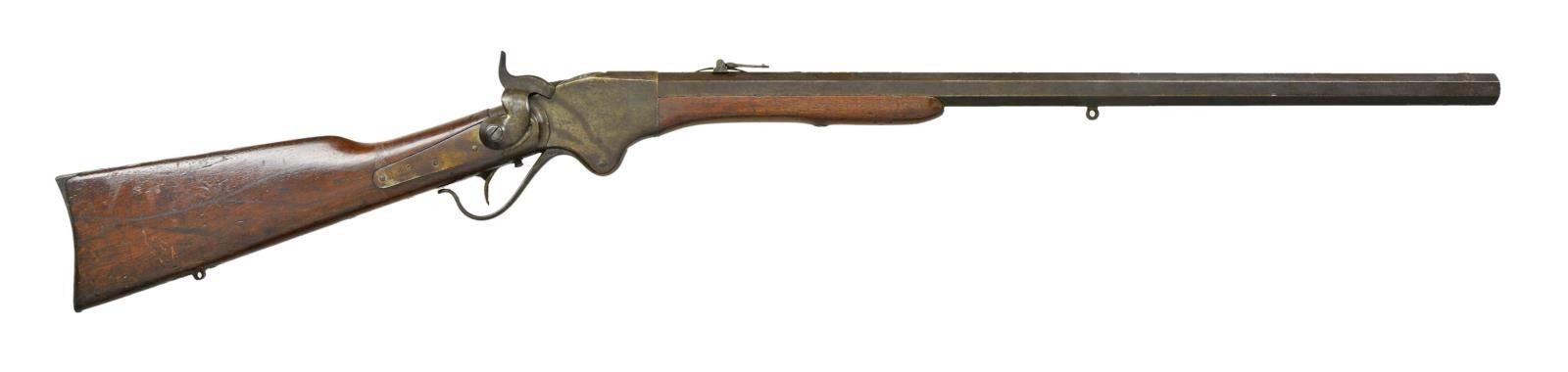 RIFLE. Cal. 56-46 Spencer. S# 15309. Bbl. 28 3/4" heavy weight octagon measuring 1 1/8" across flats at muzzle. Right barrel flat is marked "SCHNEIDER & BROWNING SAN FRANCISCO CA." over "P A". Dovetail mounted front sight missing post. Standard military graduated leaf rear sight with filler in second dovetail. Front receiver ring marked "SPENCER REPEATING / RIFLE CO. BOSTON MASS. / PAT'D MARCH 6, 1860". An added open hole is located within the marking. Left side of action has bar only for saddle ring. 9" Walnut sporter forearm. Refinished forearm shows heavy wear between attachment screw and action. Such wear is indicative in use on cross stocks which were normally used by buffalo hunters in the American west. Original straight grip stock with steel buttplate and inletted swivel base, front swivel ring is barrel mounted. Tubular magazine is not present. "American Gunsmiths" by Frank M. Sellers lists "SCHNEIDER, ALOIS, (1824-1886). San Francisco, California, 1859-1886" and "As Schneider and Browning, 1867-1871, percussion 1/2 stock and target guns". Schneider held several patents for breechloading firearms and method of rifling. Weight: 12 lbs., 6.4 oz. CONDITION: metal has dark patina appearance with added coat of varnish protection. Wood shows heavy wear and handling marks. Dark pitted bore retains largely intact rifling. (01-21349/DS). ANTIQUE. $2,500-4,000.