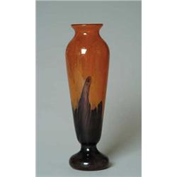 Lot 1094 SCHNEIDER VASE. Wonderful Schneider vase has brown foot extending in irregular lines up into body. Body of vase is wonderful fiery orange in mottled and swirled shades giving appearance of flames. Signed on foot with engraved signature "Schneider France" with engraved outline of vase. SIZE: 13-1/4" t. CONDITION: Very good to excellent. 5-70022 (650-750)