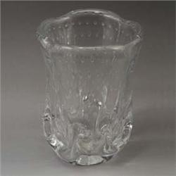 SCHNEIDER clear glass vase, 1940s, with scalloped rim, pinched base, and internal controlled bubbles. Normal wear/scratches to bottom. Acid-etched stamp mark, "Depose/Schneider". 8 1/4" x 6" $900-1,200