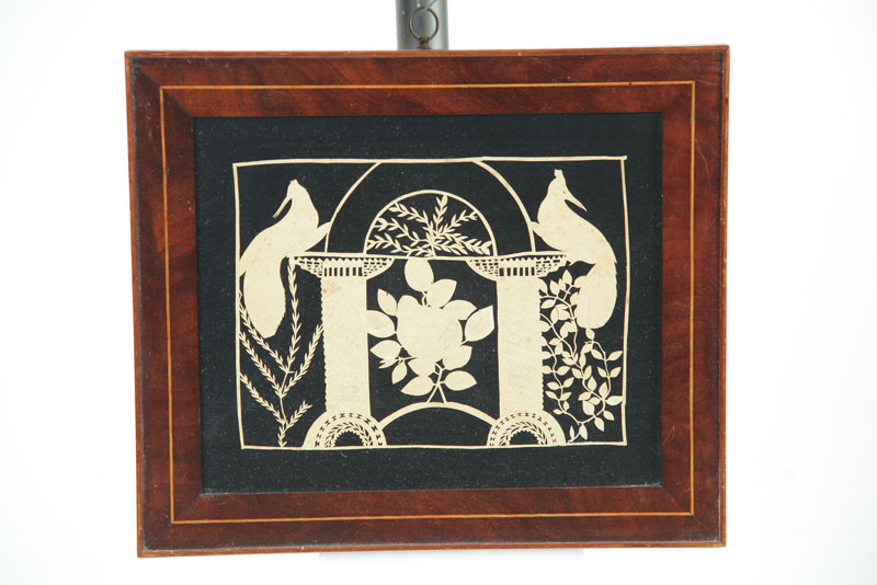 American, 19th century. Detailed paper cutout of birds on pedestals with cut work details. In an inlaid frame, 10 3/4"h. 12 3/4"w.