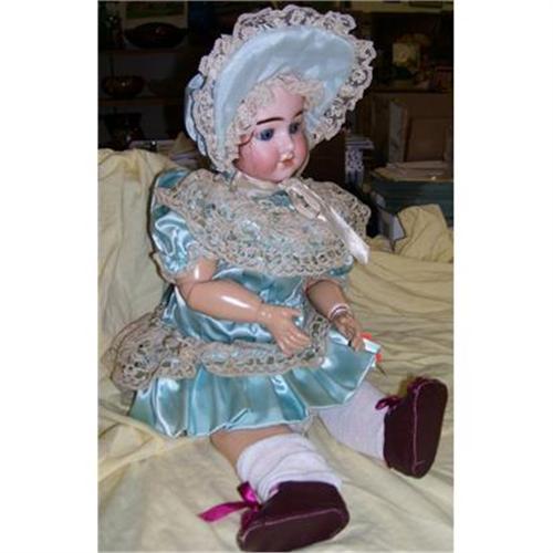 THIS IS A GOOD 21" SCHOENAU & HOFFMASTER CHARACTER CHILD DOLL IN A BLUE DRESS. SHE HAS OPEN MOUTH, GLASS EYES, PAINTED EYEBROWS AND LASHES. WE BELIEVE THESE ARE HER ORIGINAL CLOTHES. SHE HAS SWIVEL JOINTS. SHE HAS A GOOD BODY, BUT SHE DOES HAVE A SLIGHT CRACKED FACE ON THE RIGHT SIDE THAT IS NOT NOTICABLE TO THE NAKED EYE. #4000