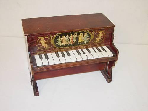SCHOENHUT CHILDS TOY PIANO GRAIN PAINTED W/ NEO-CLASSICAL WOMEN SIGNED ON REVERSE CHARLOTTE ELIZABETH KINNEY 1908 - PAINT WEAR & LOSSES;