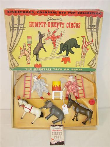 SCHOENHUT HUMPTY-DUMPTY CIRCUS IN ORIGINAL BOX INCLUDES (2) CLOWNS, (2) LADDERS, CHAIR, BARREL, PLATFORM, DONKEY, ELEPHANT, HORSE - ALL IN EXCELLENT IN THE BOX CONDITION - MINOR DAMAGE & LOSSES TO BOX